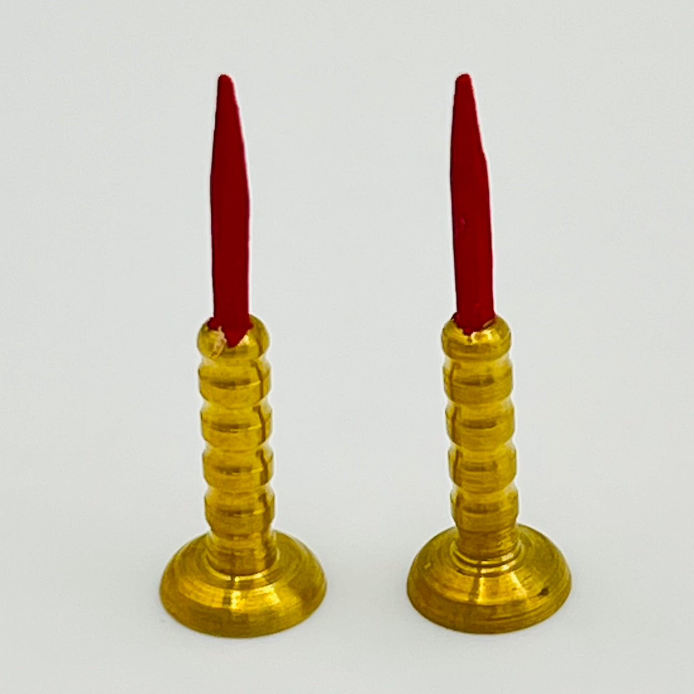 Pair of brass candle holders with red candles. Metal. 1 3/16" tall. 1/12 scale miniature for your dollhouse or diorama.
