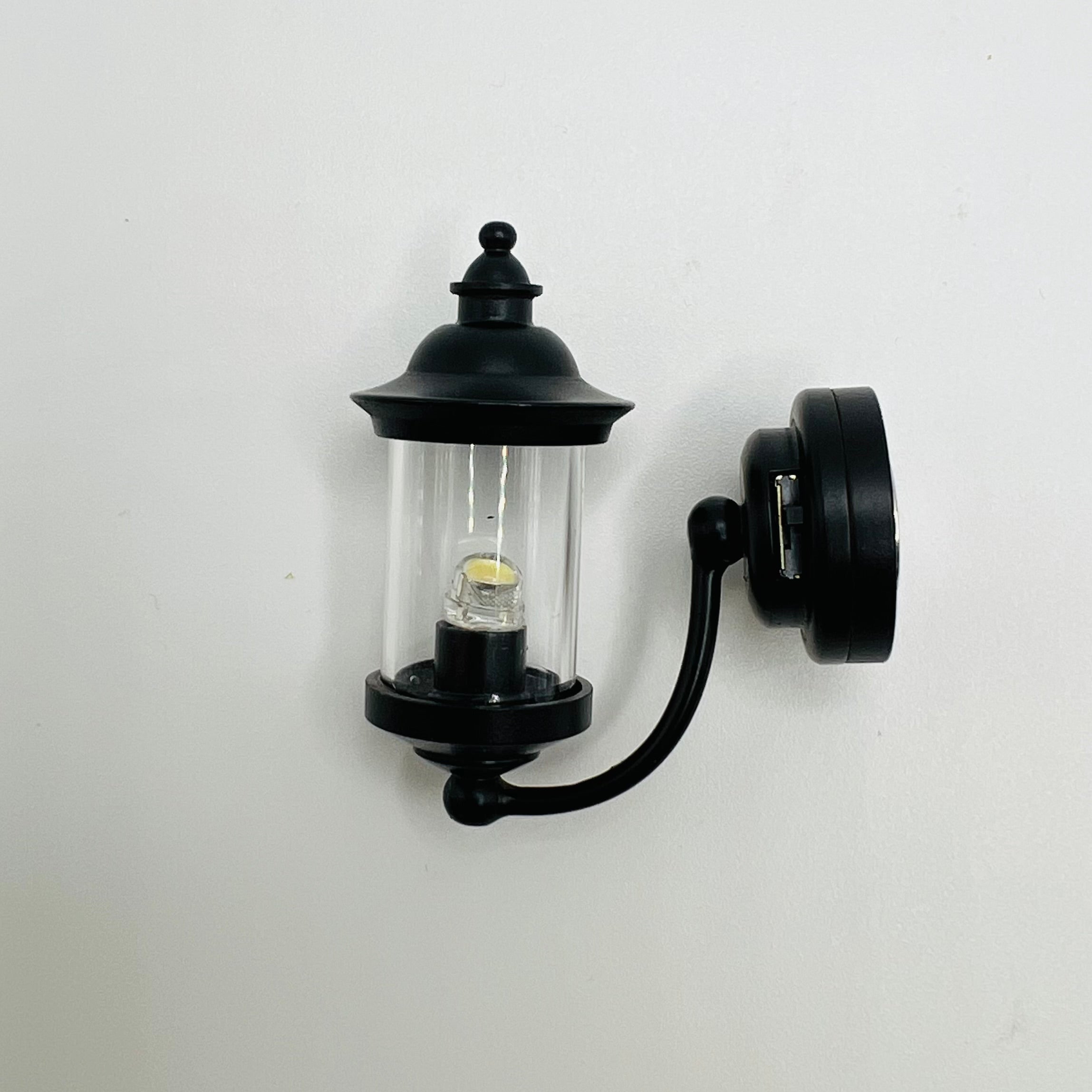 Miniature 1/12 scale battery powered light for porch. Excellent light source with replaceable battery. Battery included. Metal and glass. 1 3/4" H x 1 3/8" D x 3/4" W.