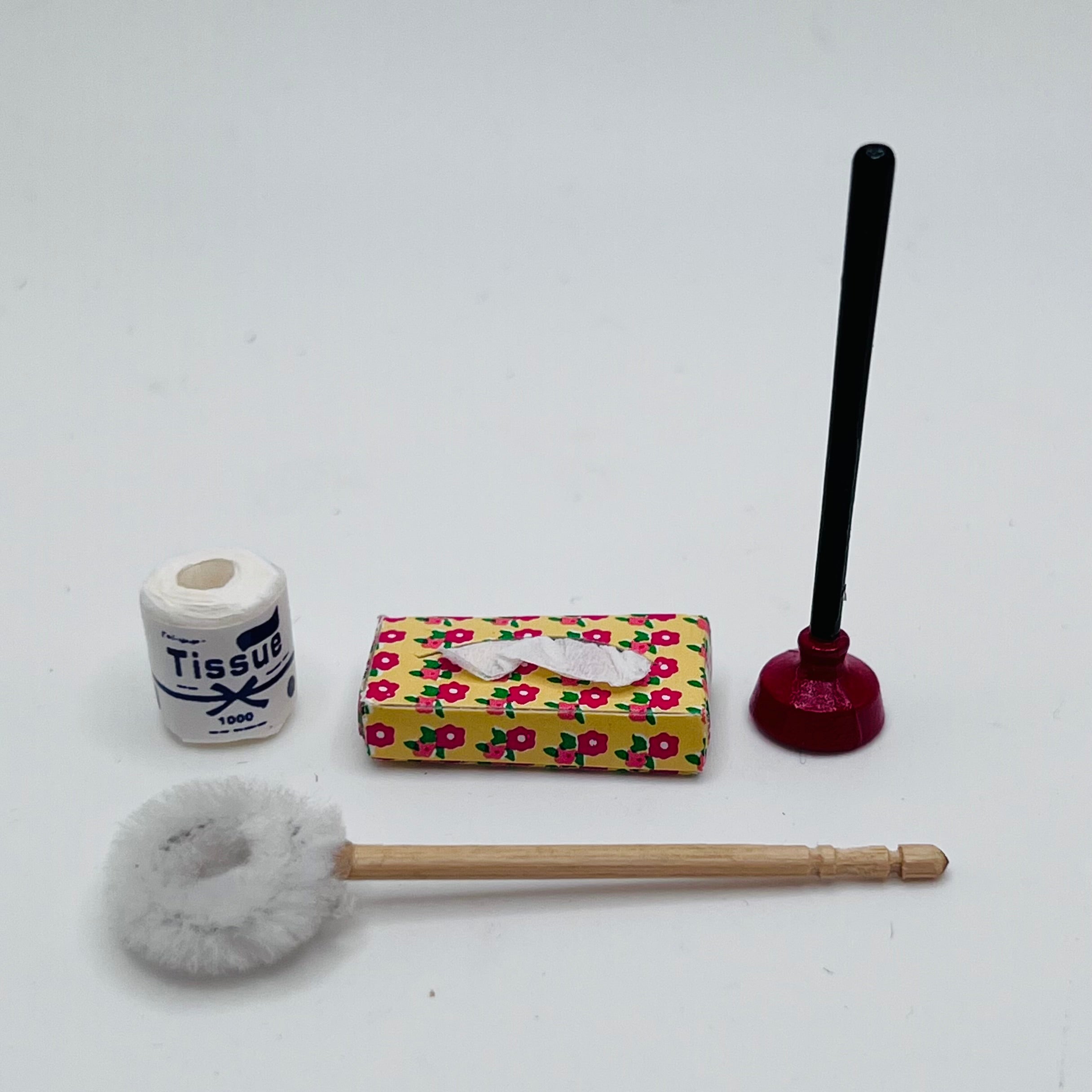 This is an 4-piece set of essential items for almost every bathroom. It includes a tissue box, a plunger, toilet paper and a cleaning brush. 1/12 scale for dollhouse or diorama.