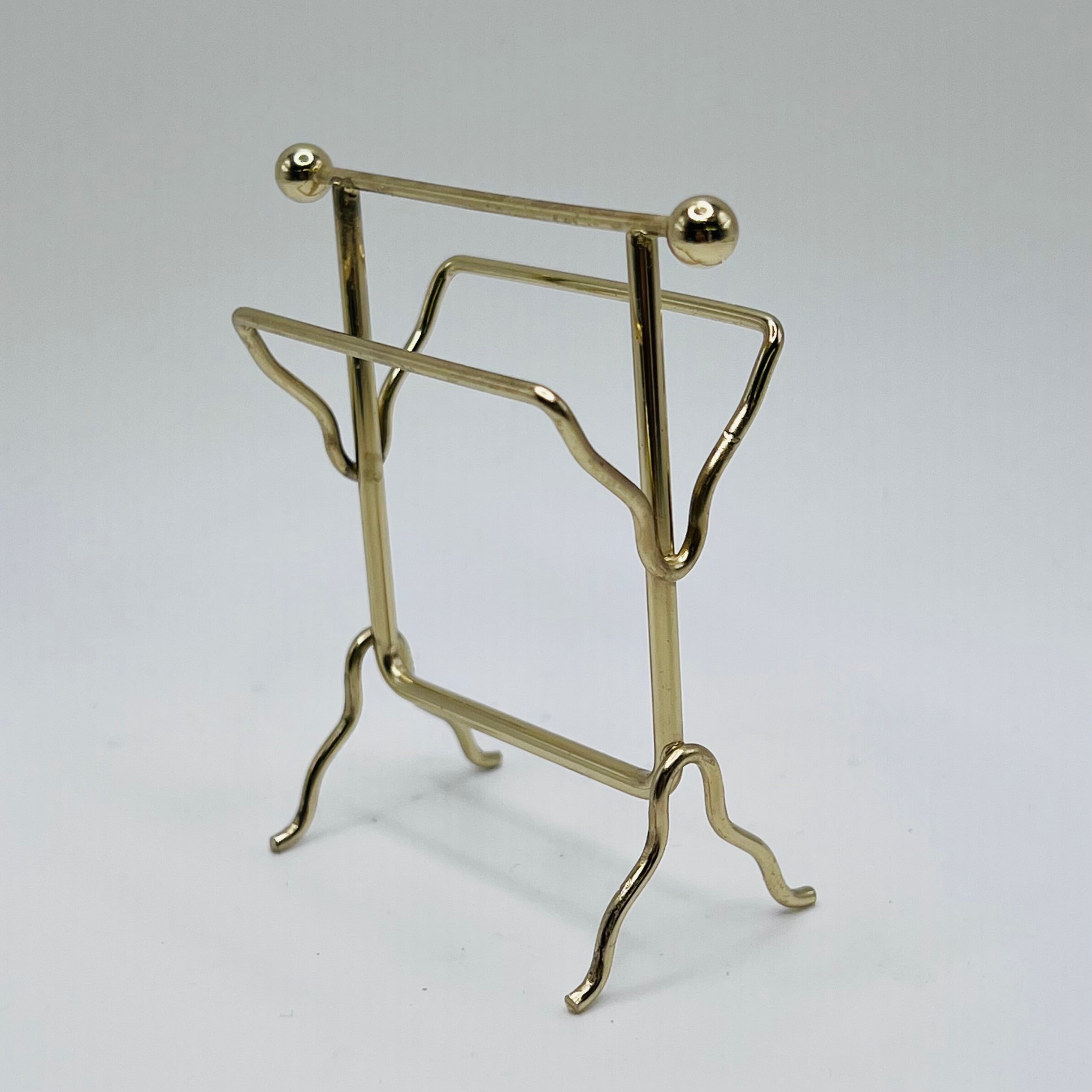 This simple brass towel rack great way to add detail to your 1/12 scale dollhouse or diorama bathroom. 3" H x 2 5/8" W x 1 11/8"D