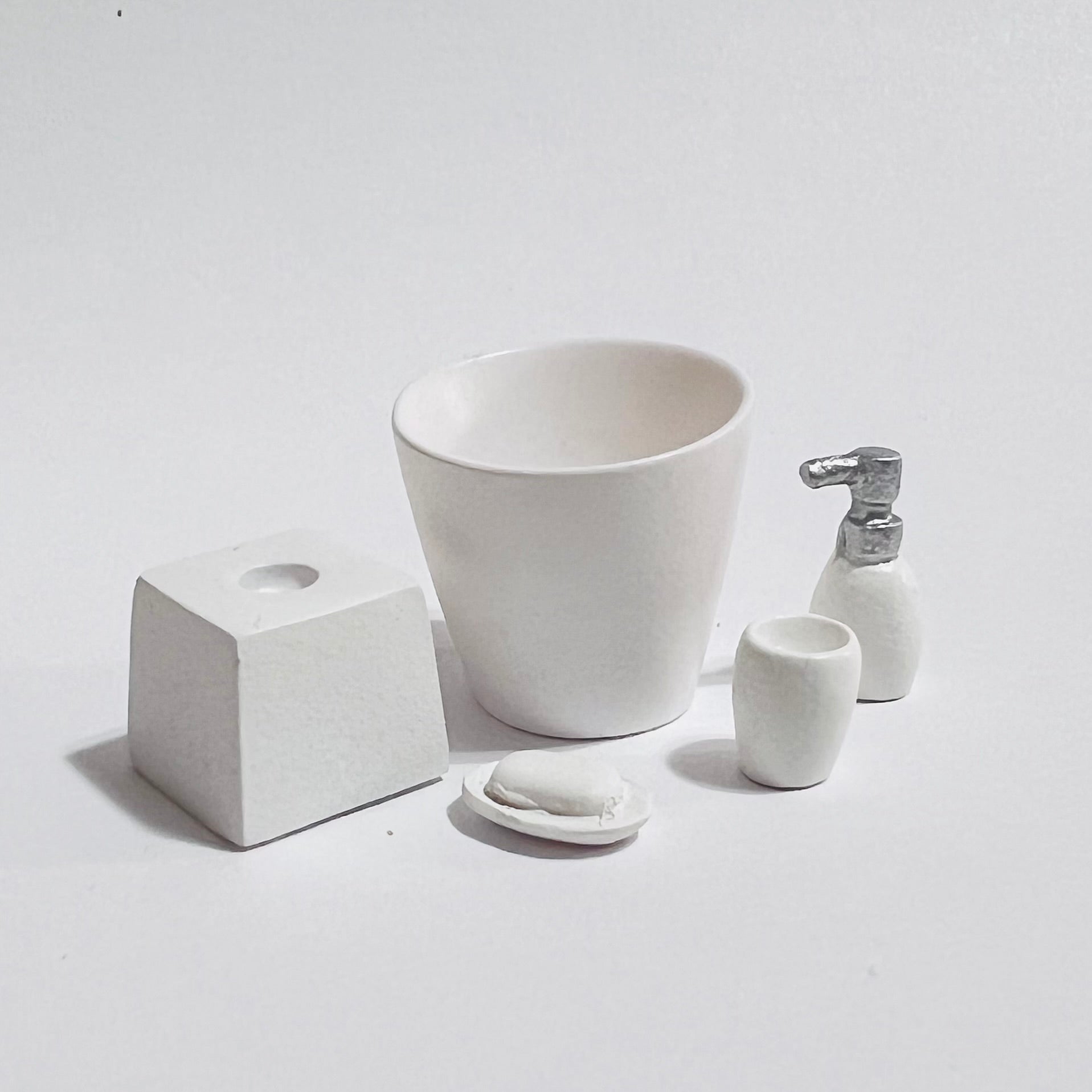 This is an 5-piece set of essential items for almost every bathroom. It even includes a soap dish, a lotion bottle and a garbage can. 1/12 scale for dollhouse or diorama. Made of resin.