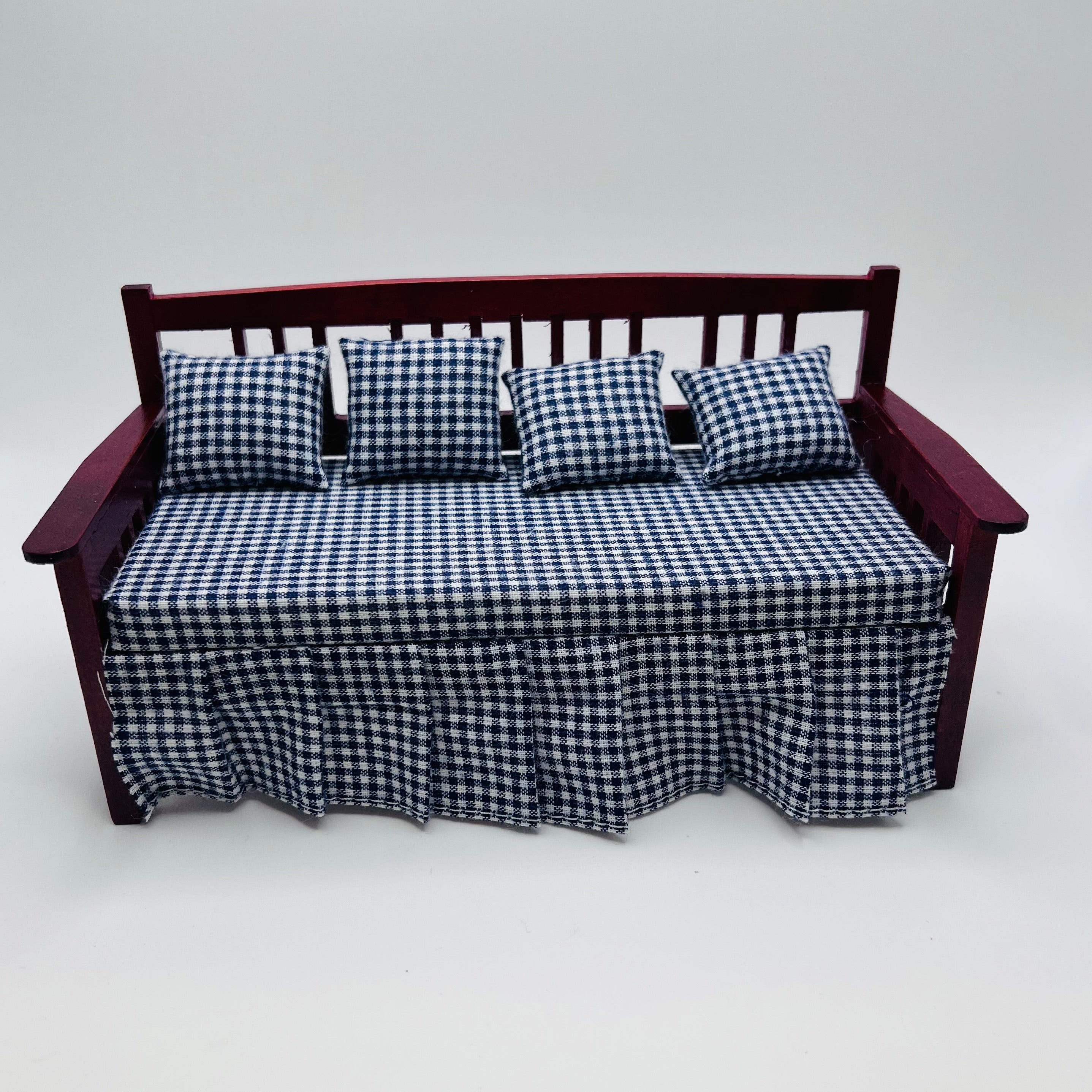 Beautiful mahogany day bed with an 4 cushions. 1/12 scale miniature for your dollhouse or diorama. 3 5/8" high x 7 1/4" long x 3 1/4" deep.