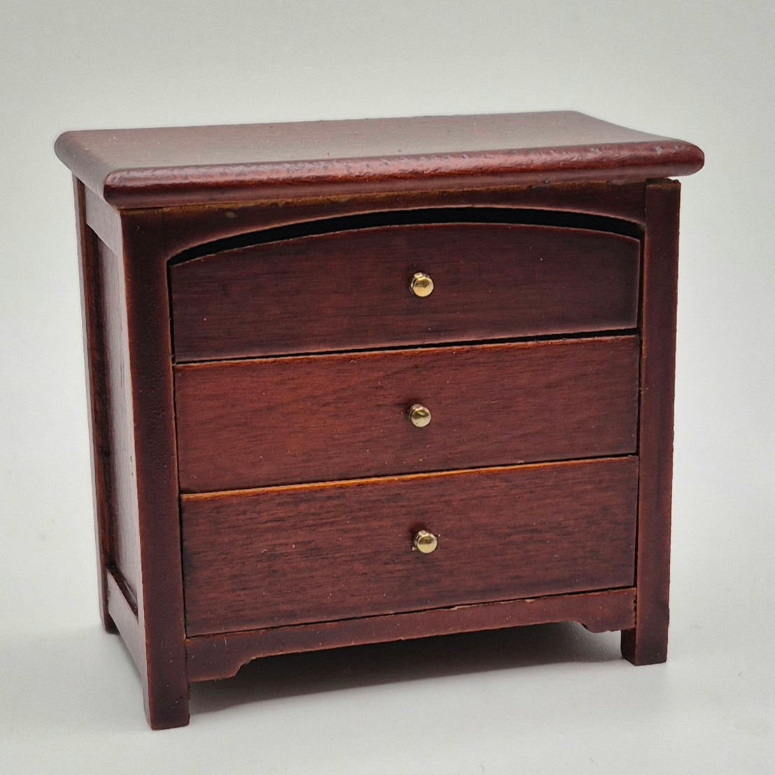 Walnut nightstand with 3 working drawers. Includes a curved edge on the top drawer, a nice touch. Get a pair for your dollhouse or diorama bedroom. 1/12 scale miniature. 2 1/2" high x 2 3/4" wide x 1 1/2" deep.