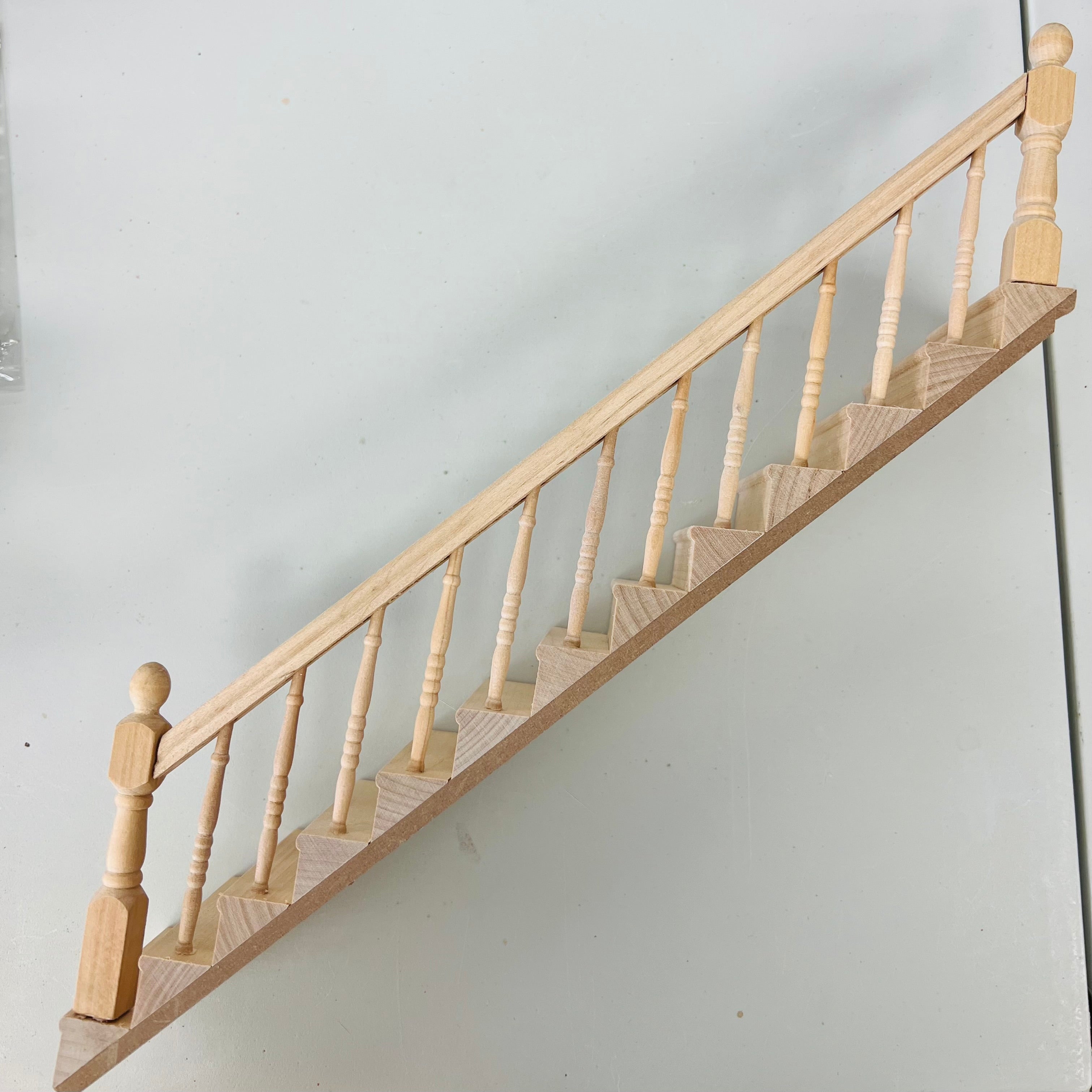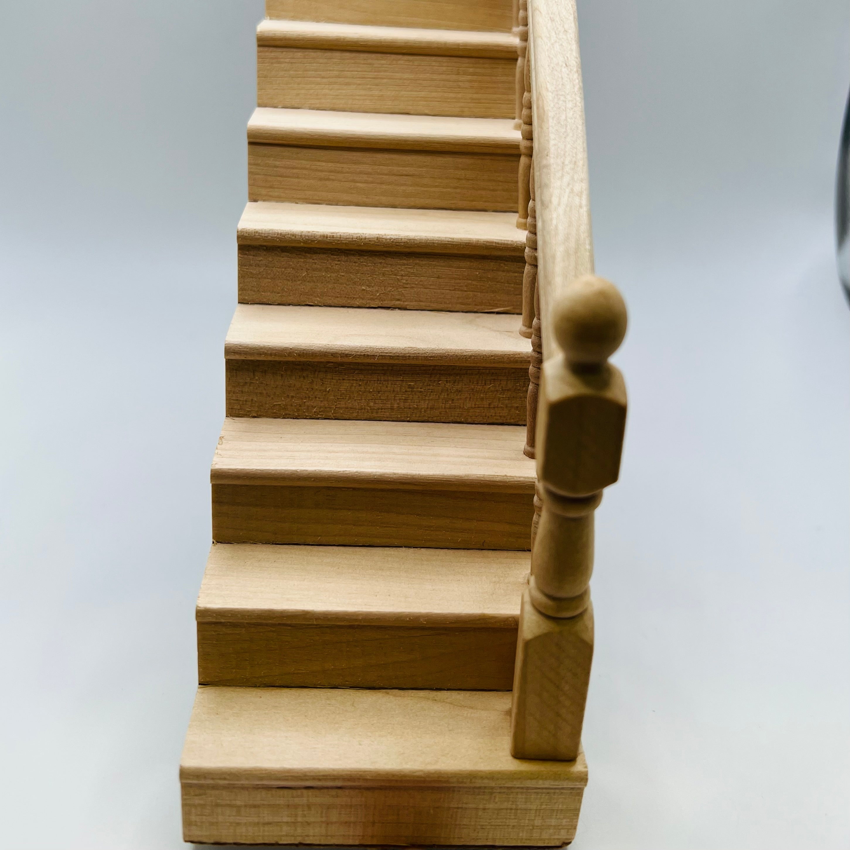 This staircase will fit ceilings up to 9" and 10". The staircase unit, including the upper newel post, is 12" high and 3 5/8" wide. 1/12 scale miniature for your dollhouse or diorama.