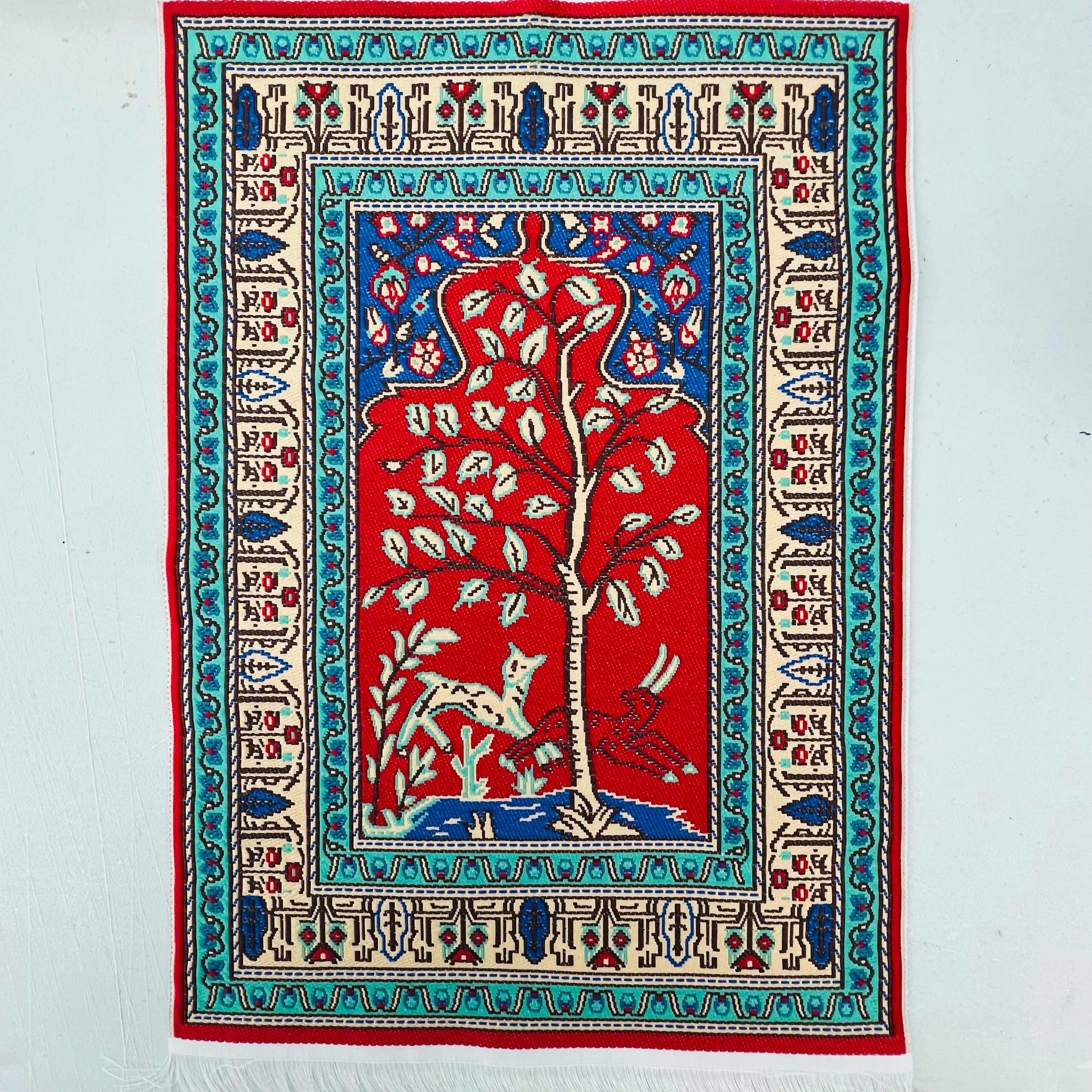 Large sized woven carpet with a tree on a red background. Surrounded by green borders and a larger beige detailed one. White fringe. Lovely for a living room, bedroom or dining room in your 1/12 scale dollhouse or diorama. 12 1/2" long x 7 3/4" wide.