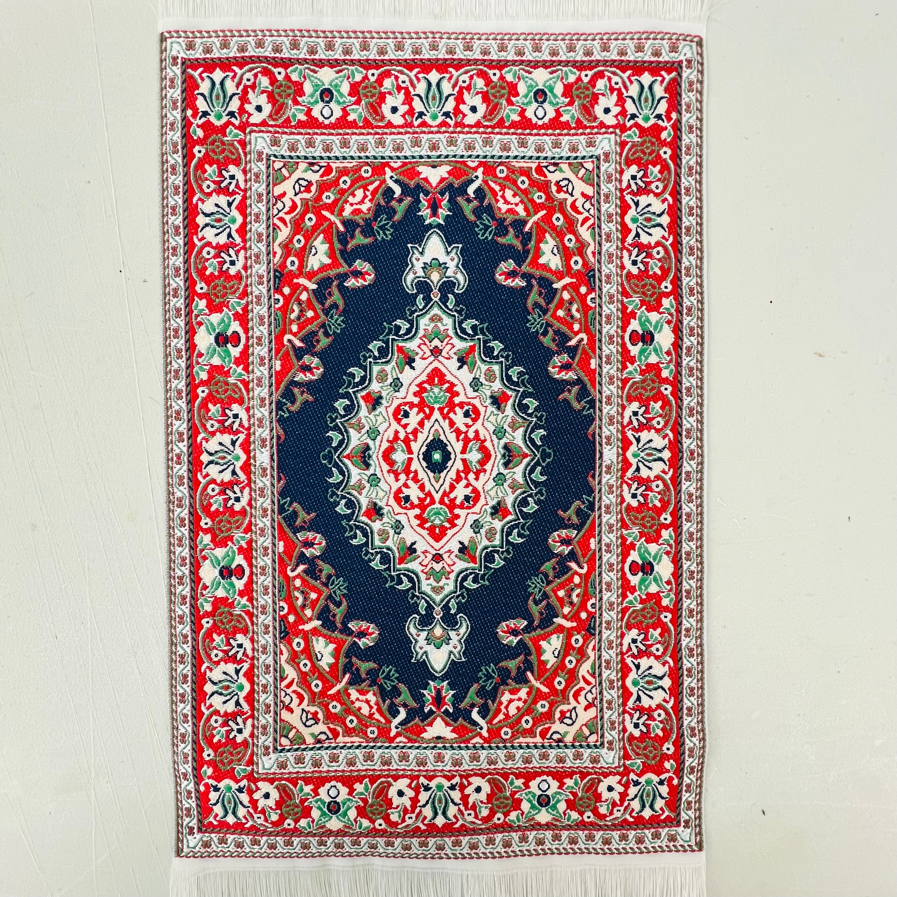 Medium sized woven carpet with a traditional blue, red and white pattern. White fringe. Lovely for a living room, bedroom or dining room in your 1/12 scale dollhouse or diorama. 10 1/2" long x 5 3/4" wide.