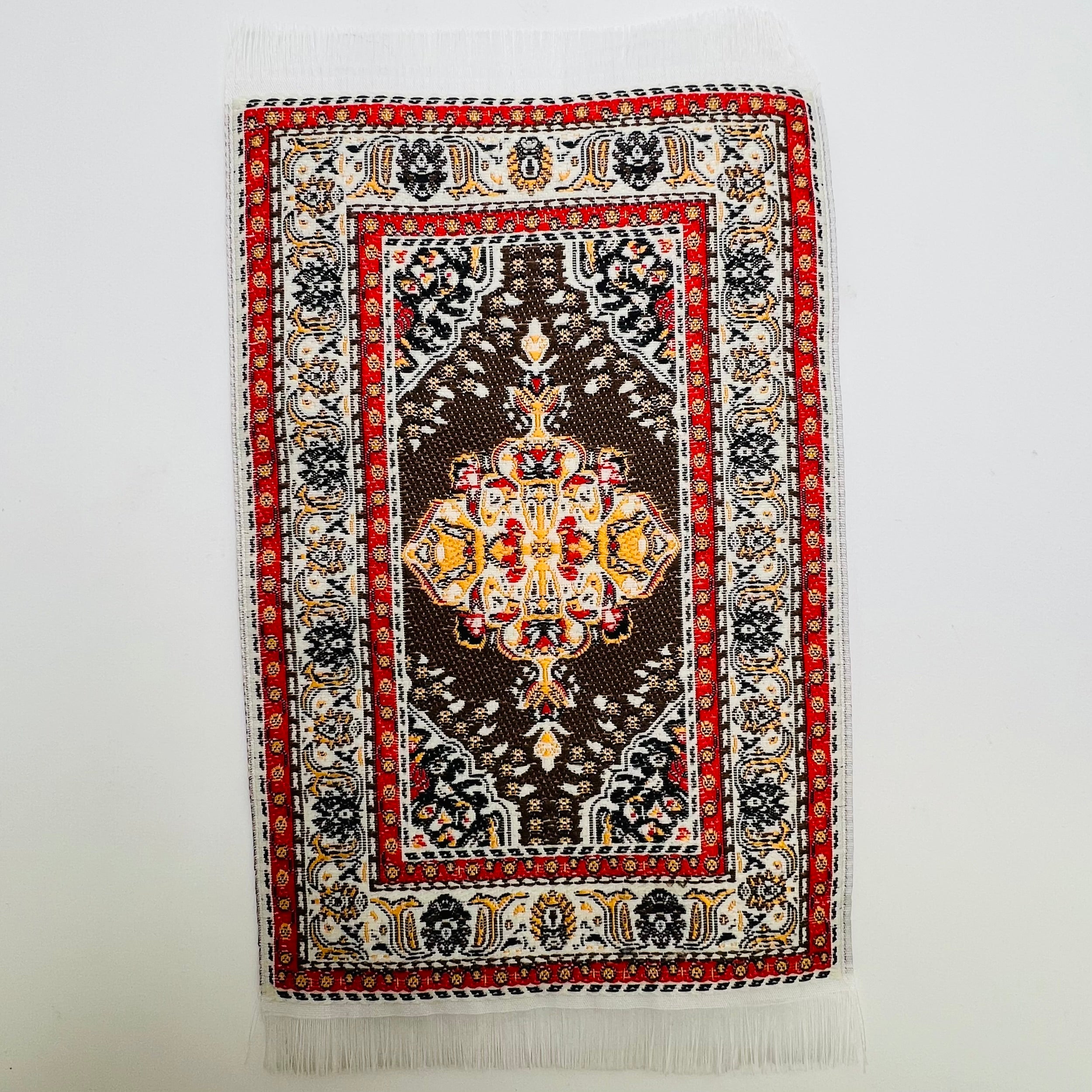 Small sized woven carpet with a traditional pattern in brown, red and yellow. White fringe. Lovely for a living room, bedroom or dining room in your 1/12 scale dollhouse or diorama. 6 1/8" long x 3 3/4" wide.