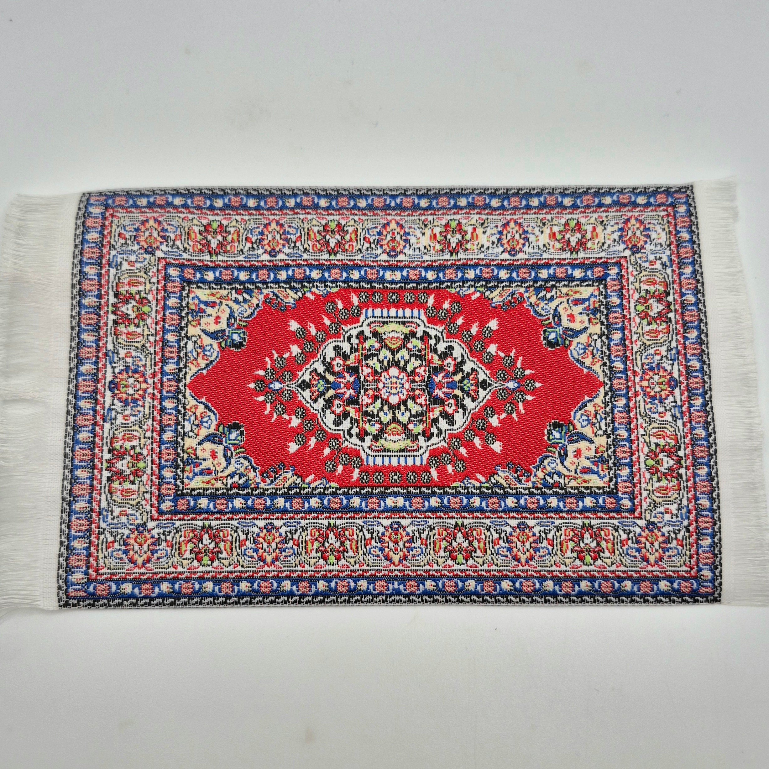 Small sized woven carpet with a traditional very detailed pattern in red, white, blue and black. White fringe. Lovely for a living room, bedroom or dining room in your 1/12 scale dollhouse or diorama. 6 1/2" long x 3 3/4" wide.