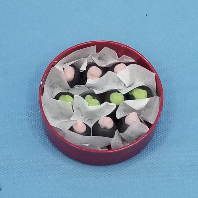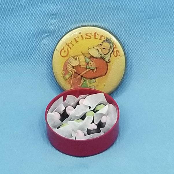 A metal tin with decorative lid for Christmas. Contains 10 pieces of candy in green and pink. Everyone needs extra sweets at Christmas! Tin measures 1" across. 1/12 scale miniature for your dollhouse or diorama.