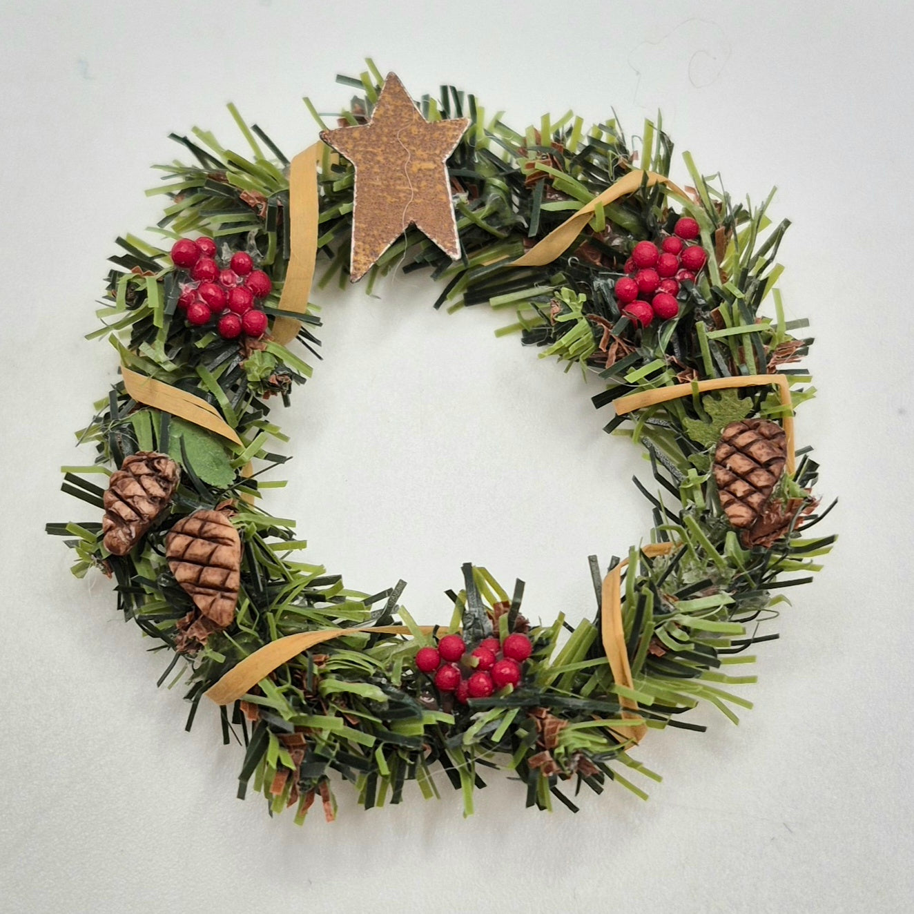 Handmade vintage Christmas Wreath with pine cones, red berries and a gold star on greenery. Ready for the front door of your 1/12 scale miniature dollhouse or diorama. 1 3/4" in diameter.
