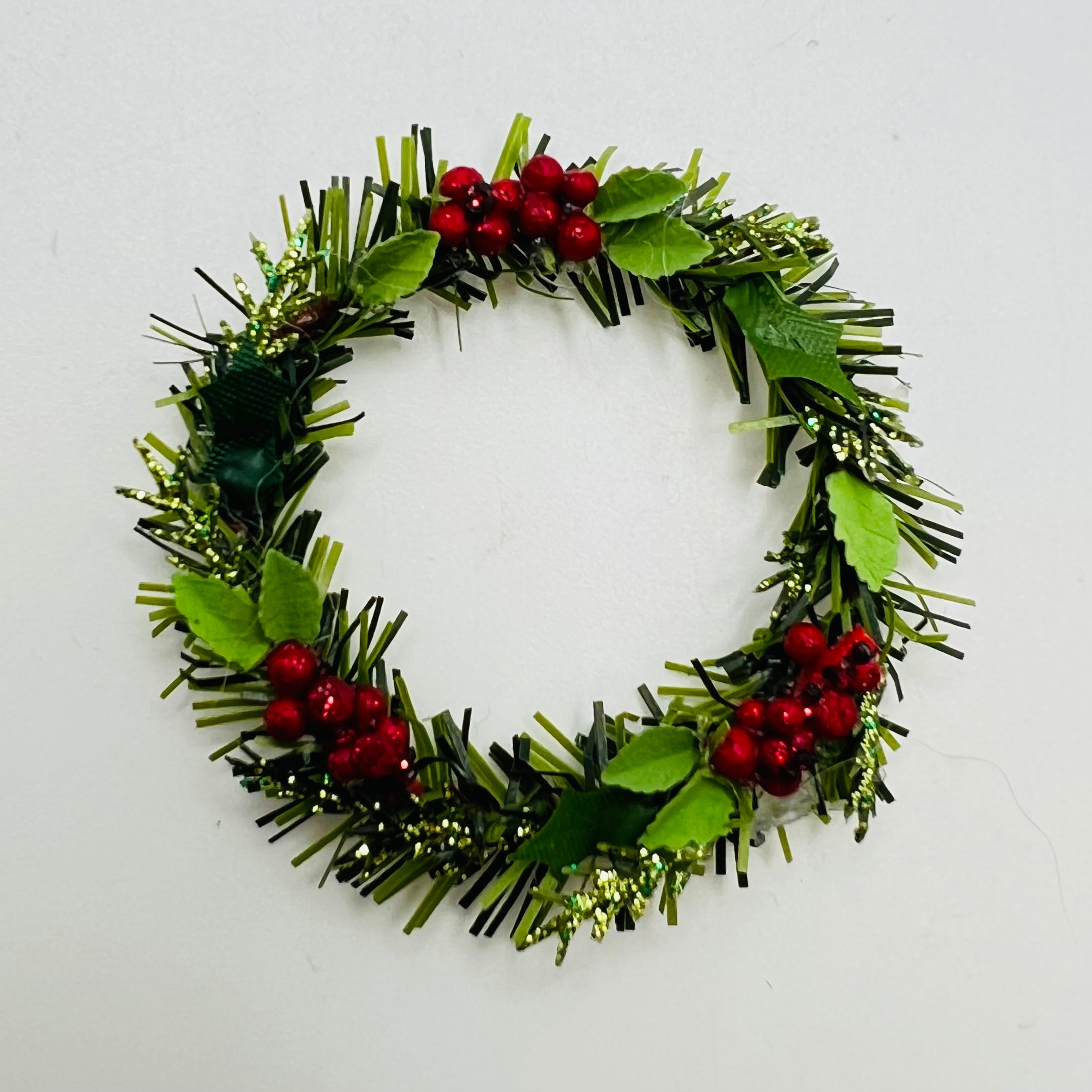 Handmade vintage Christmas Wreath with red berries on greenery. Ready for the front door of your 1/12 scale miniature dollhouse or diorama. 1 3/4" in diameter.