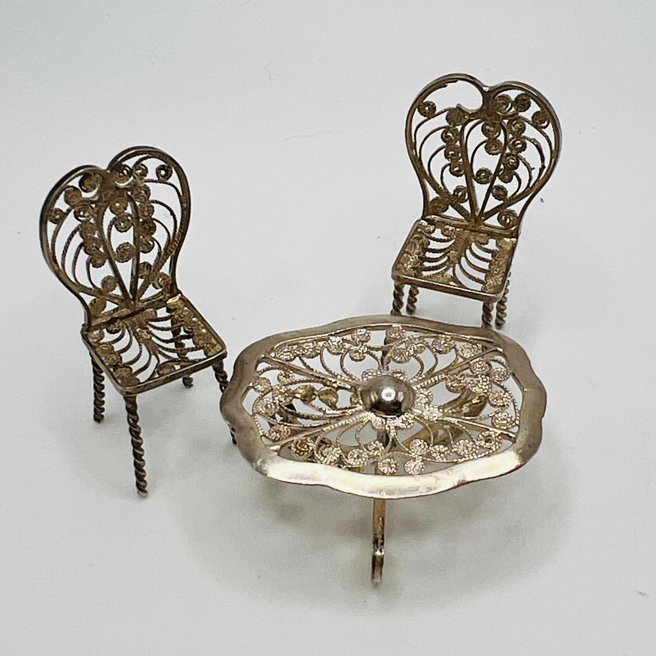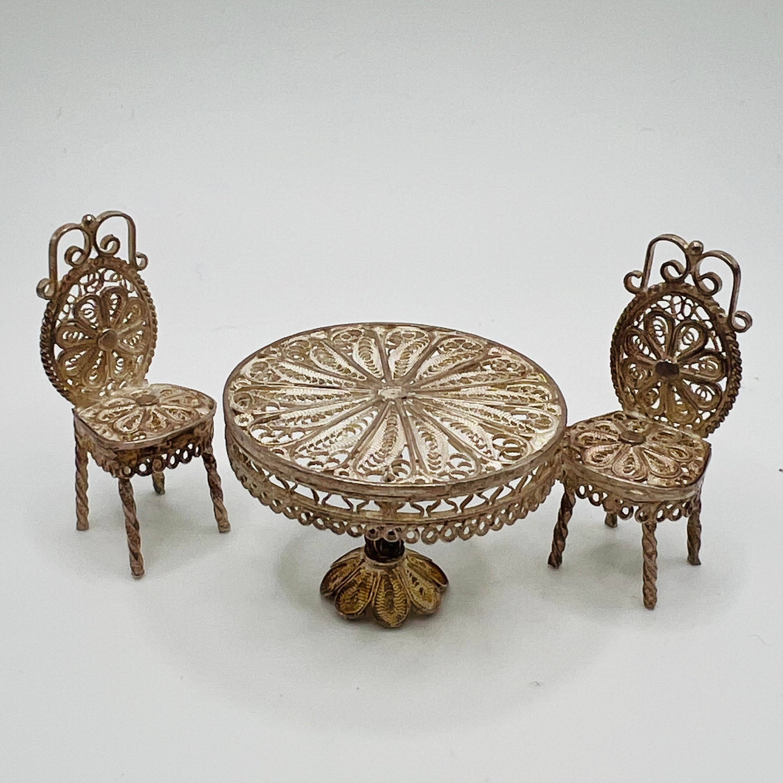 Two sets of beautiful sterling silver filigree table with 2 chairs. These pieces are vintage and have some patina to them. Please note the missing circle at the top of one chair of set #1.