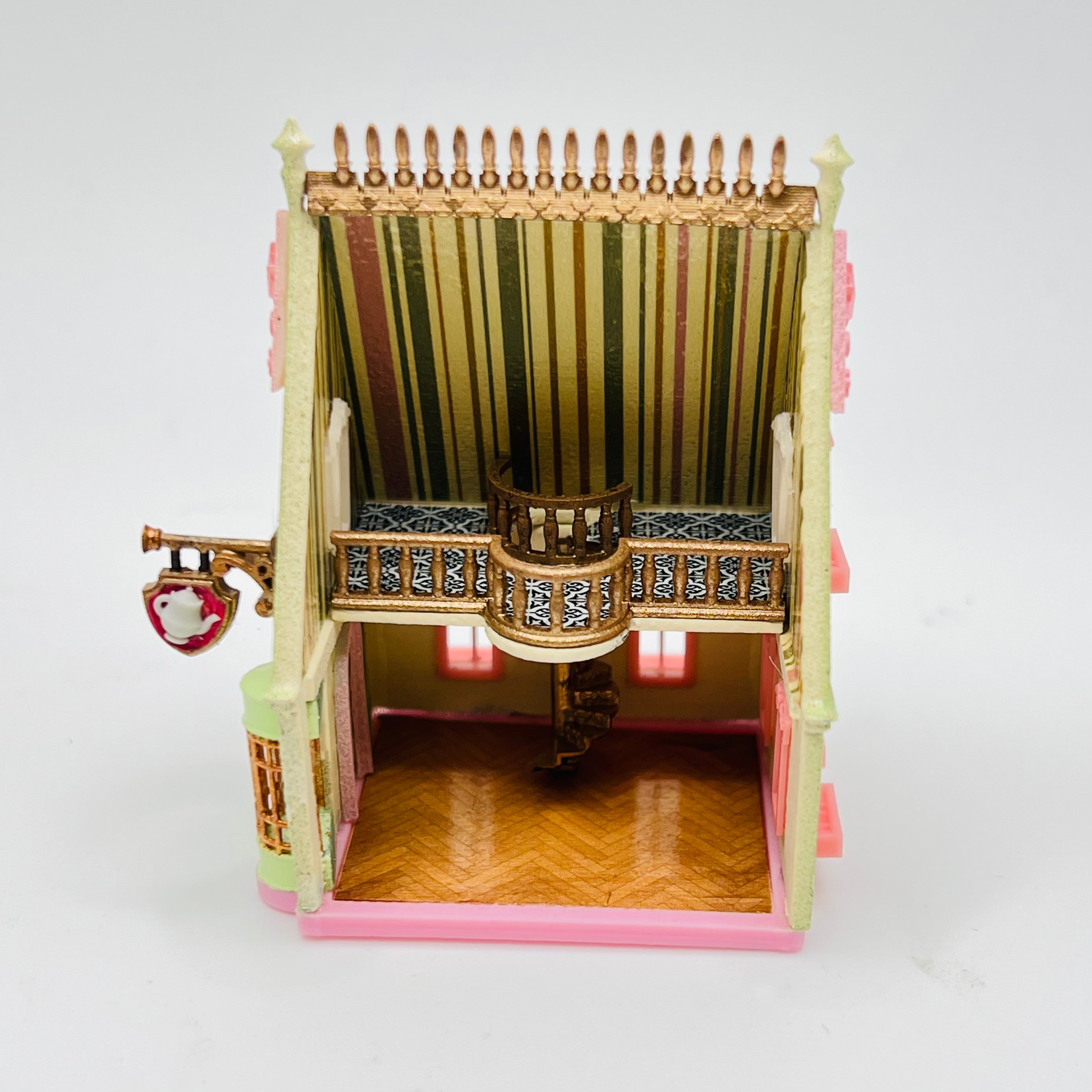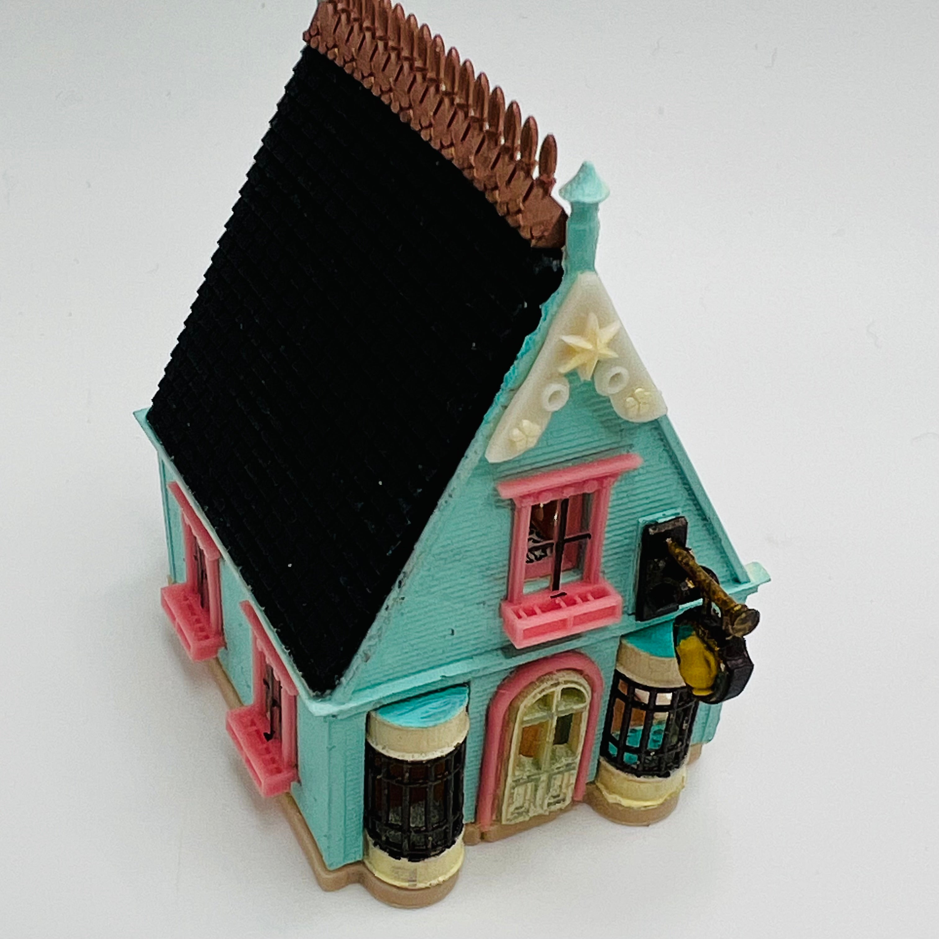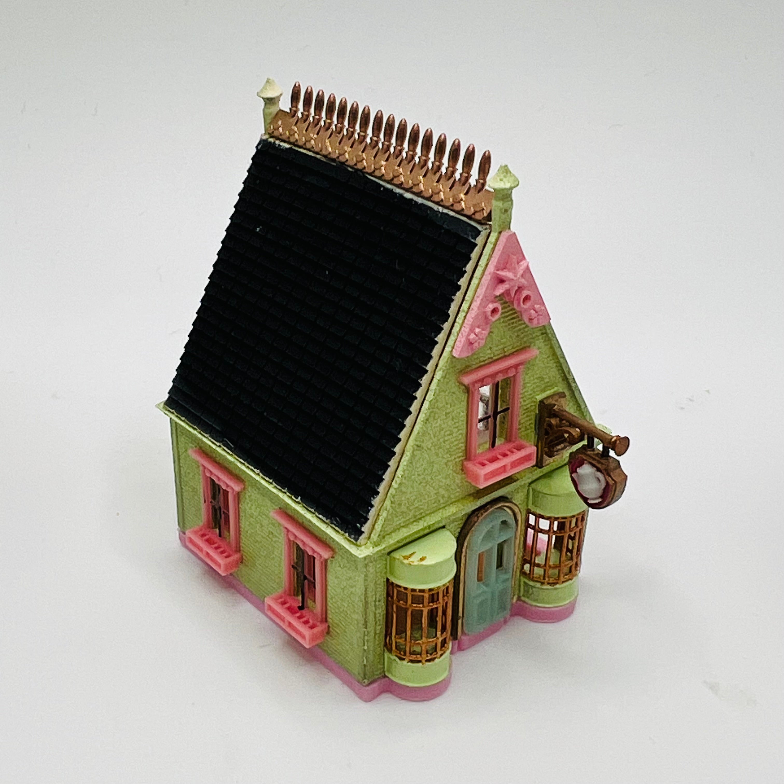 This 3D printed tea house for a dollhouse has been lovingly painted and is ready to put furniture in it! The spiral staircase is truly stunning! A dollhouse that goes in a 1/12 scale dollhouse and will hold 1/144 scale furniture. 2 1/4" tall x 2 1/16" long x 1 1/2" wide.
