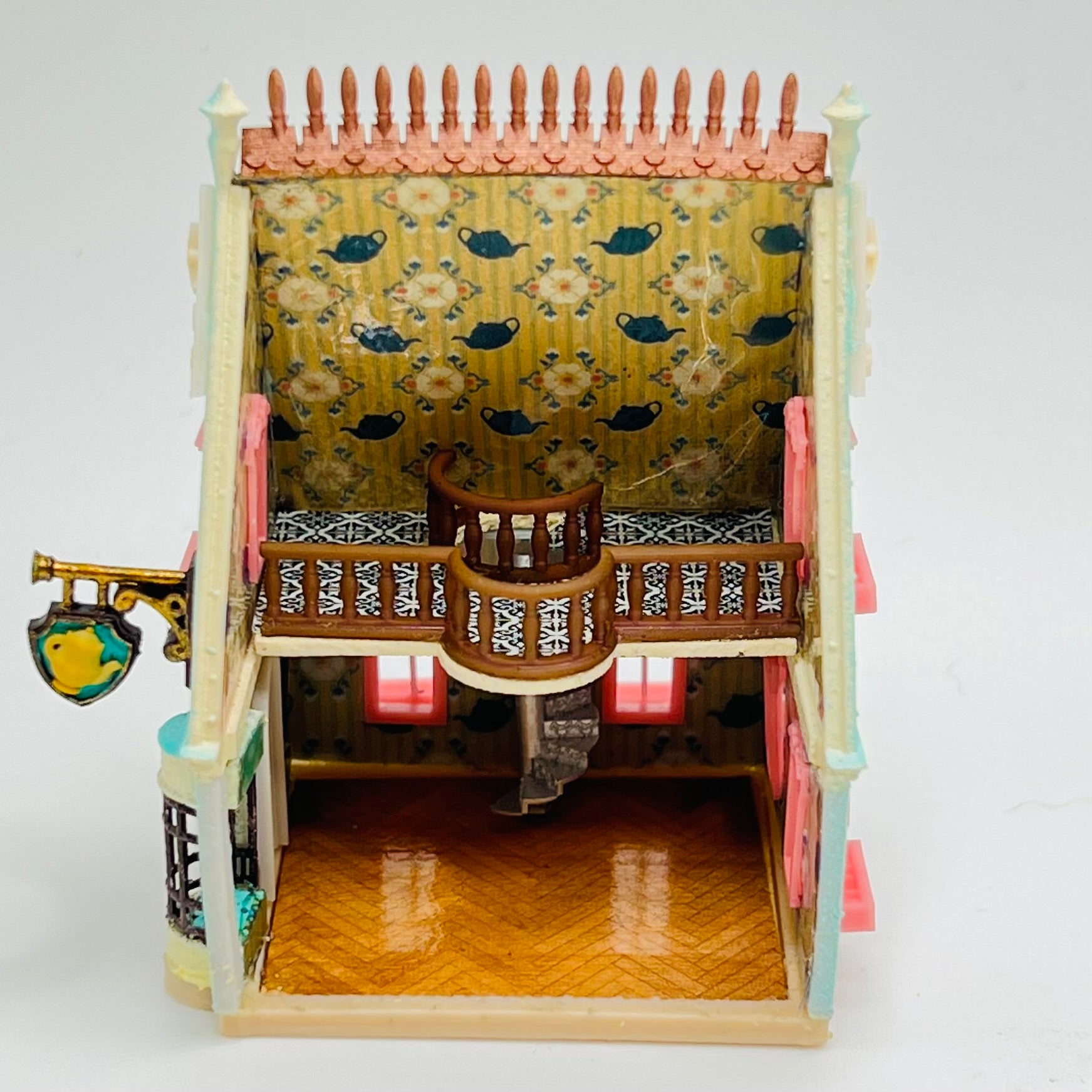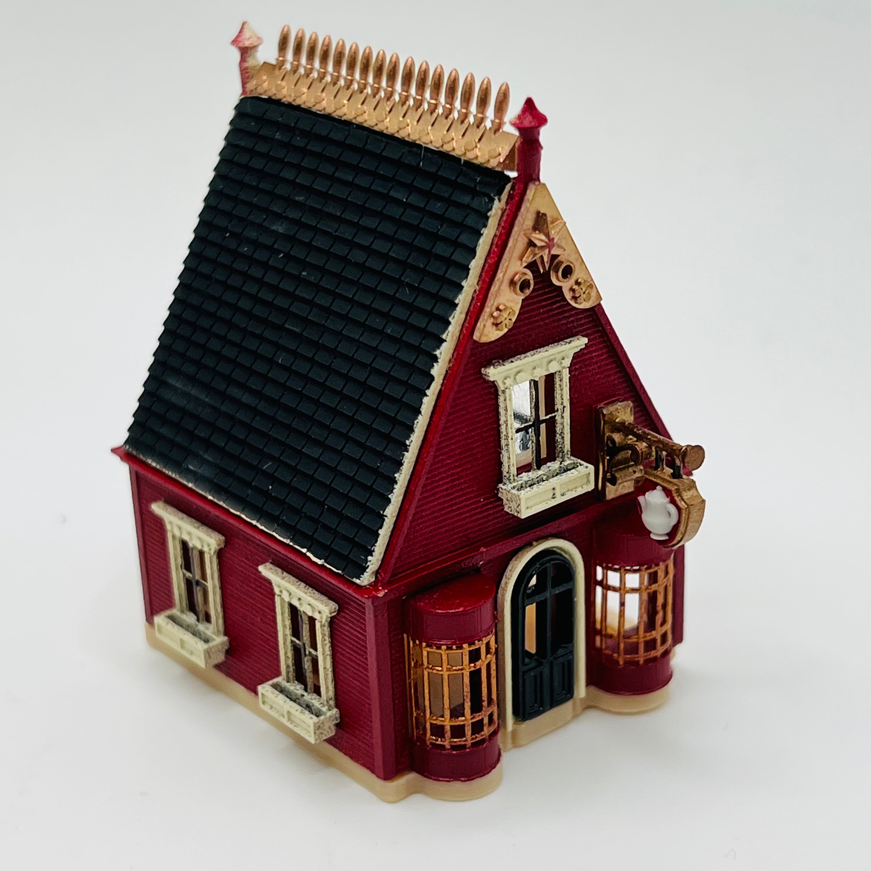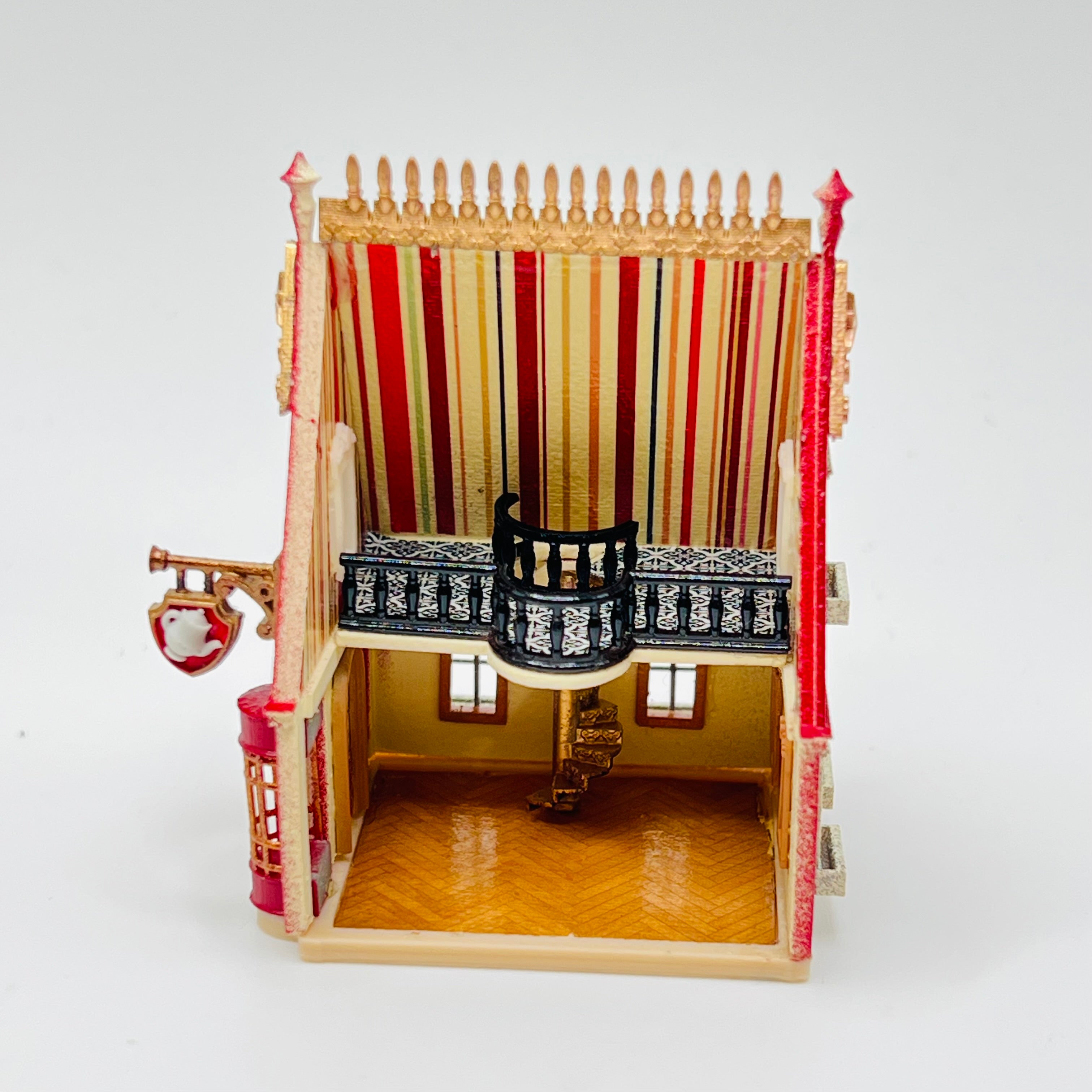 This 3D printed tea house for a dollhouse has been lovingly painted and is ready to put furniture in it! The spiral staircase is truly stunning! A dollhouse that goes in a 1/12 scale dollhouse and will hold 1/144 scale furniture. 2 1/4" tall x 2 1/16" long x 1 1/2" wide.