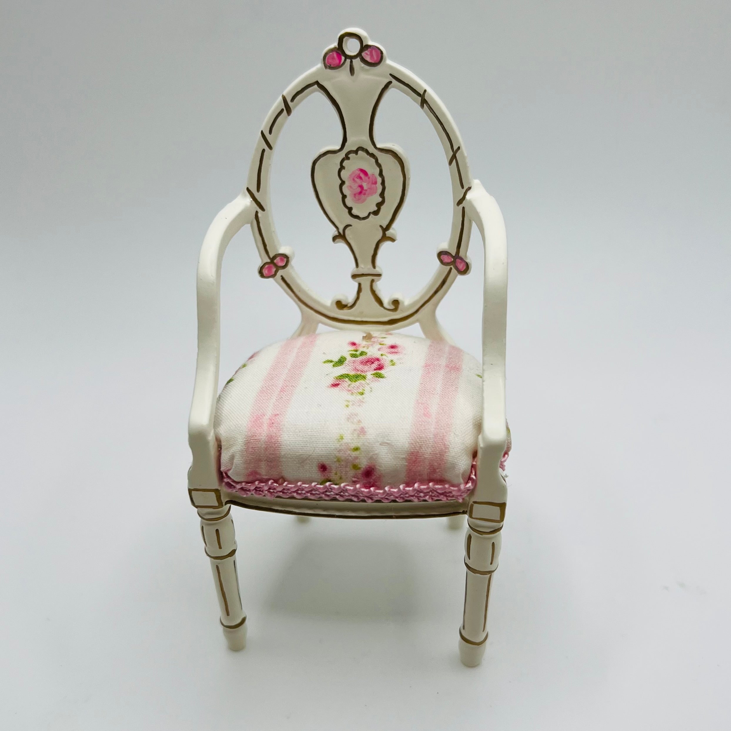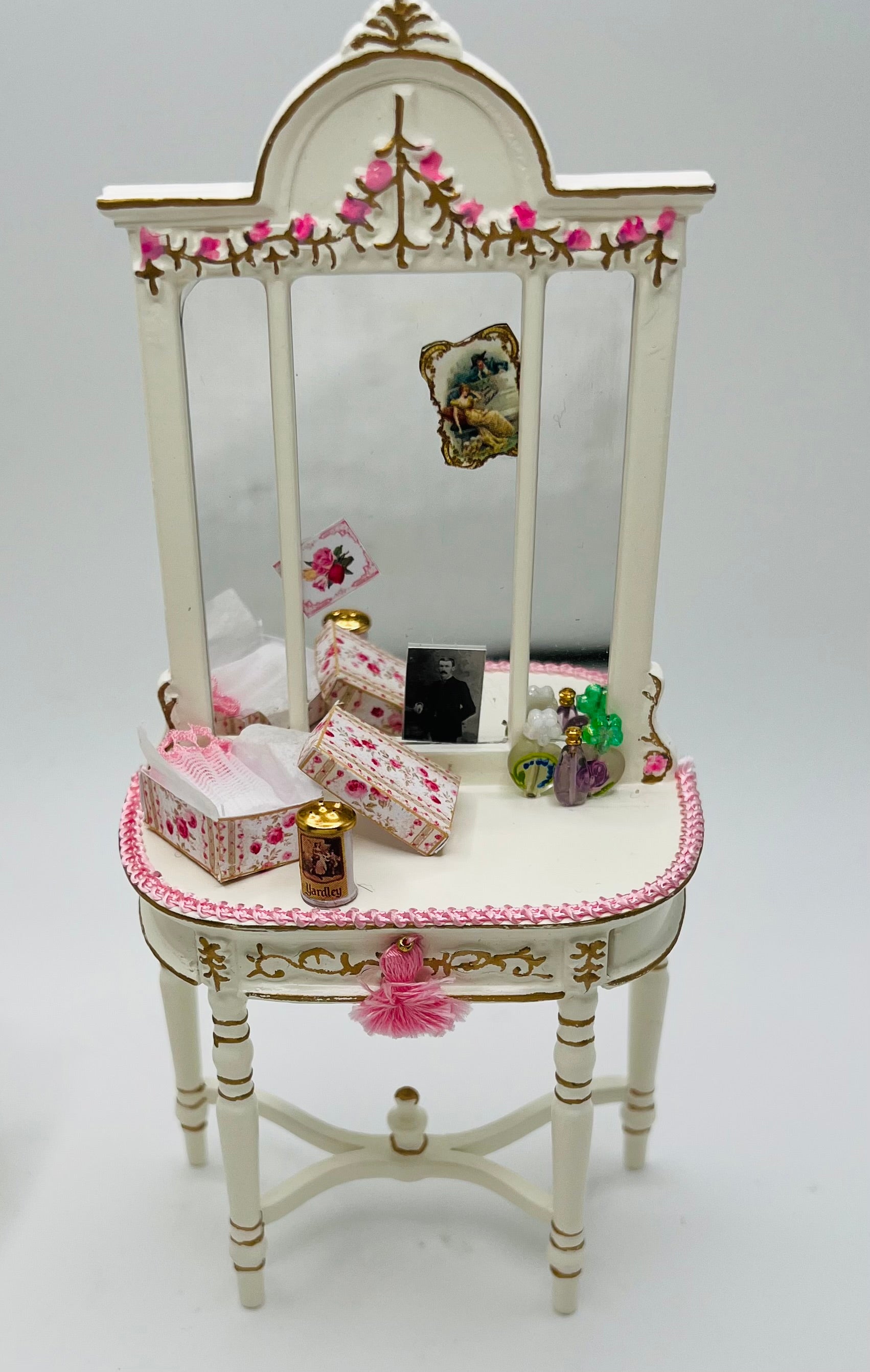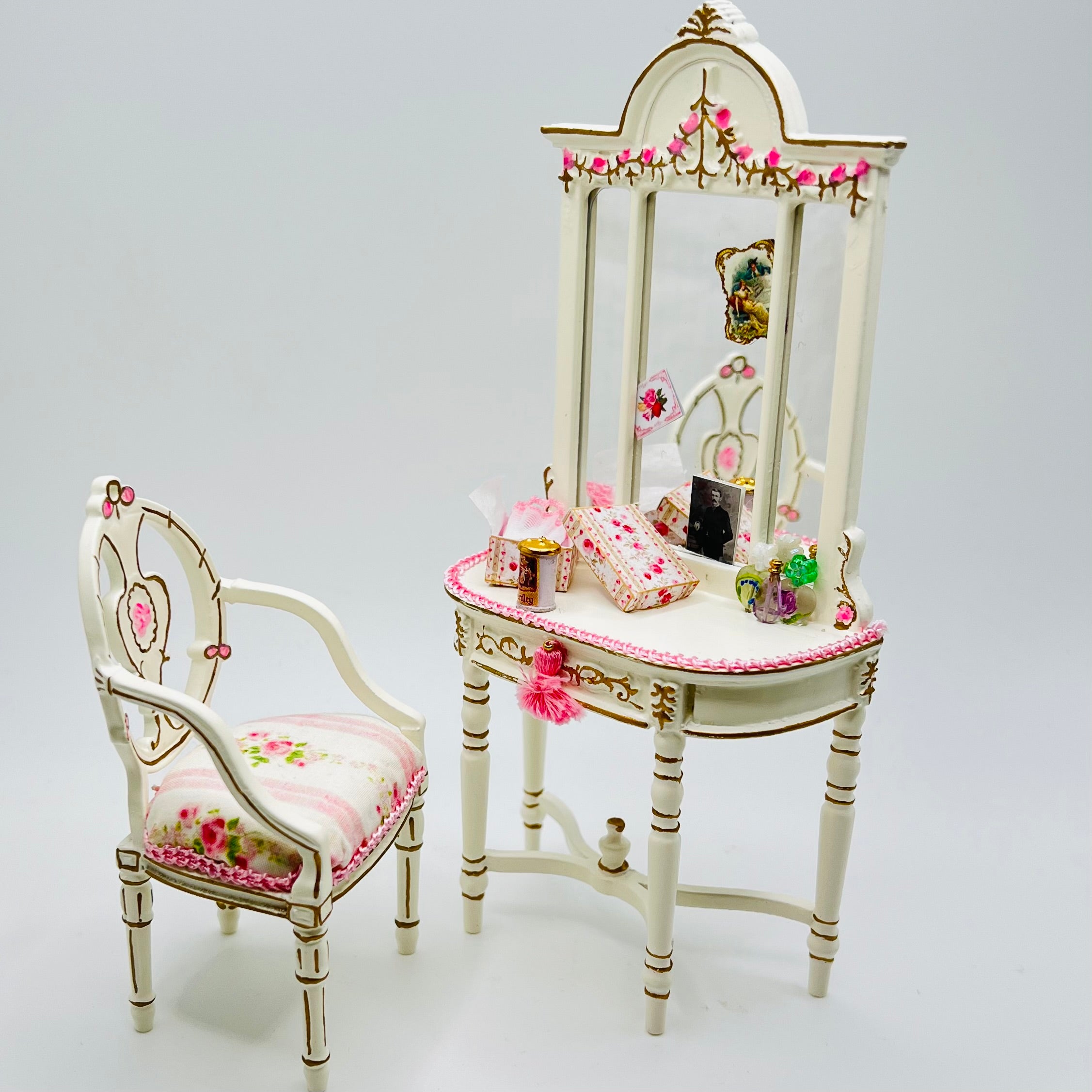 Dressing table: 6 3/4"H x 3 1/8"W x 1 5/8"D. Chair: 3 7/8"H x 2"W x 1 7/8"D.