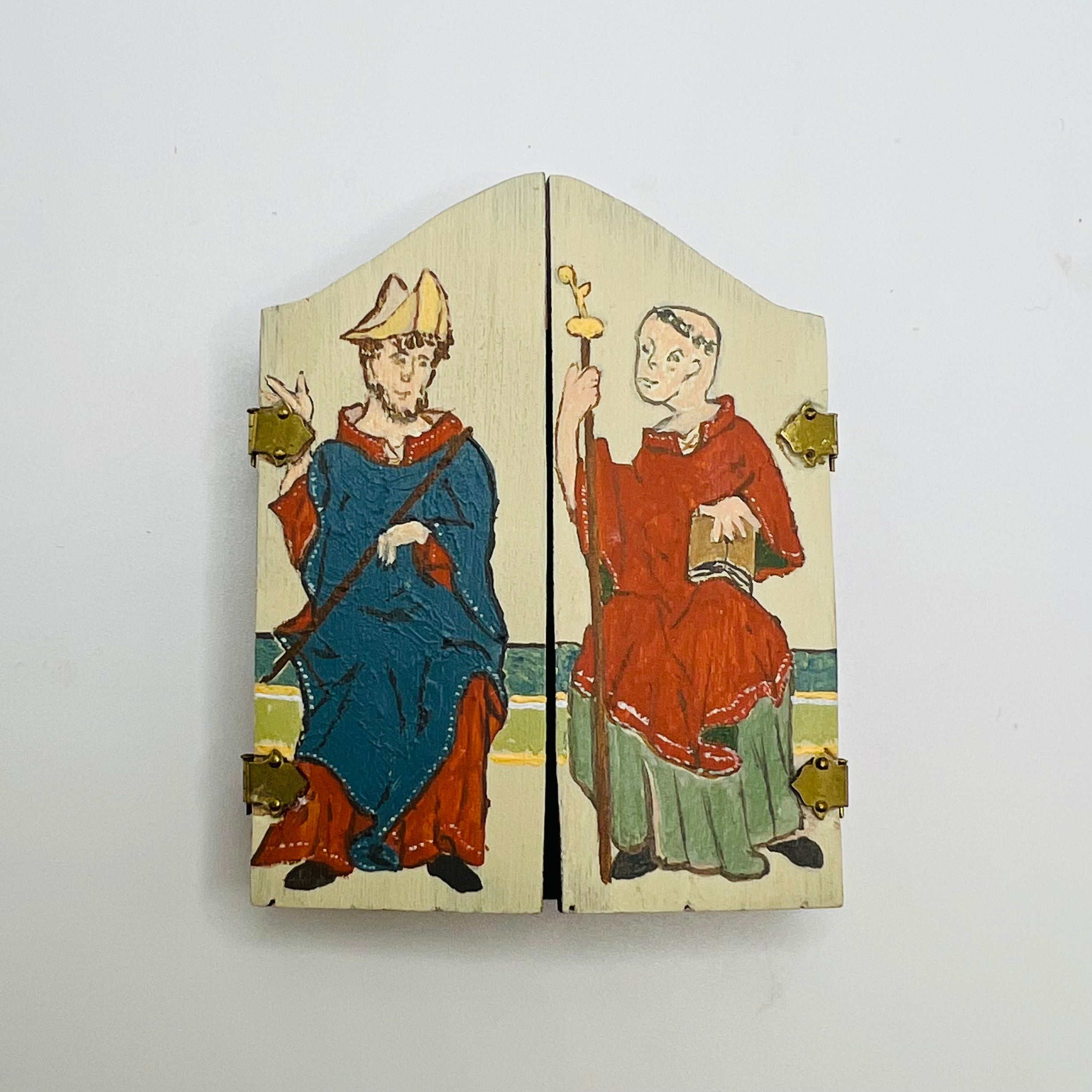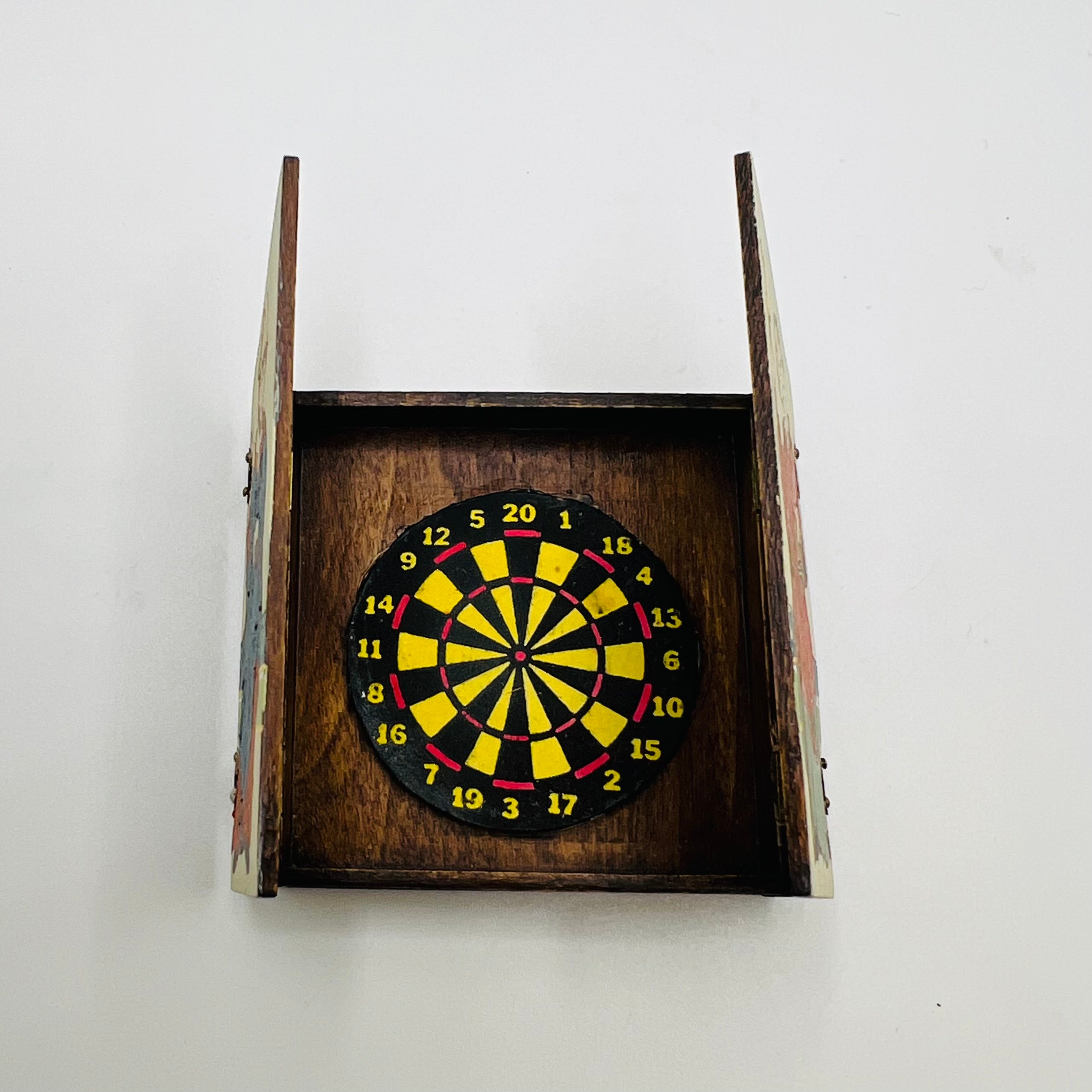 This nicely painted wooden cabinet hides a dartboard. The two-panel depicts figures in a style reminiscent of medieval art.