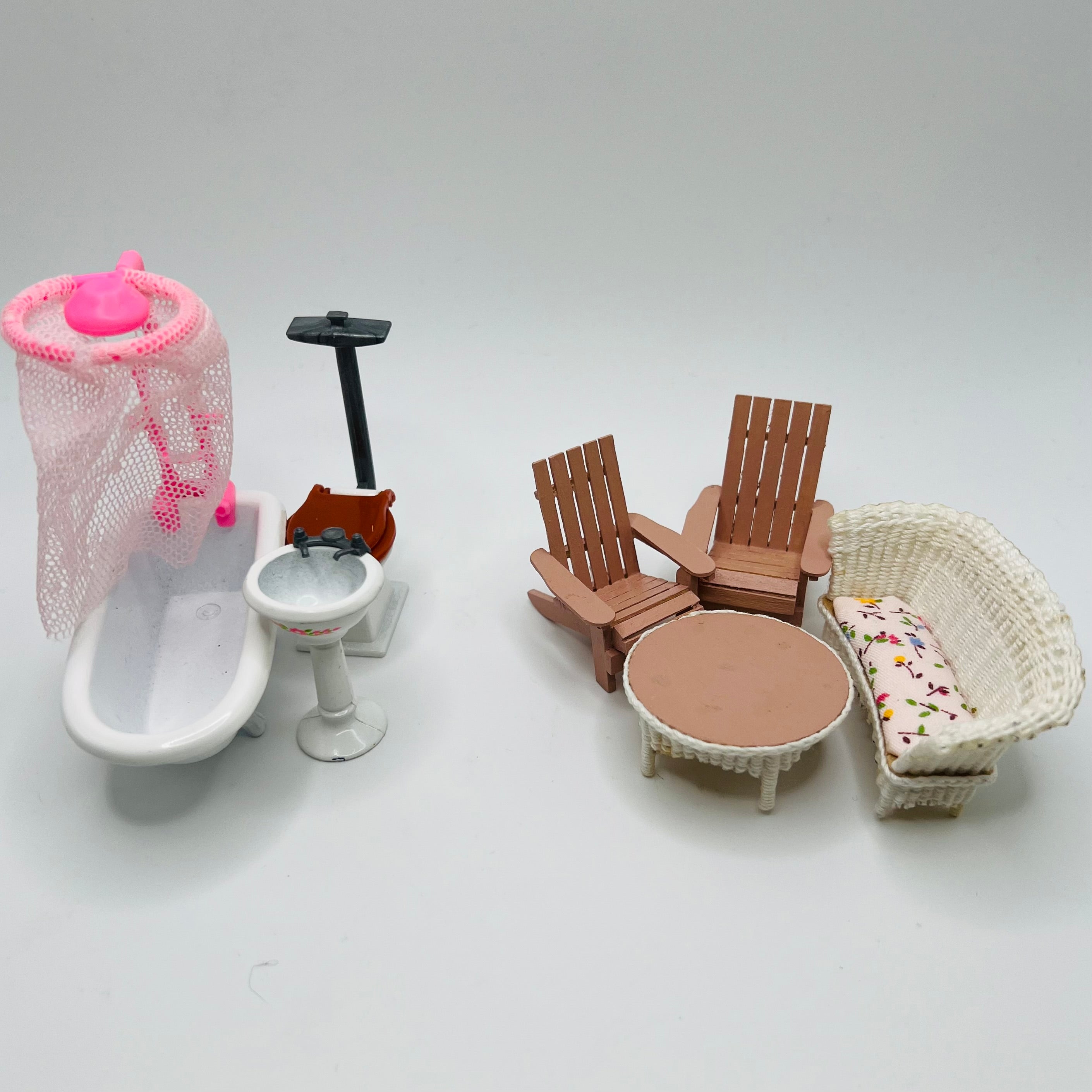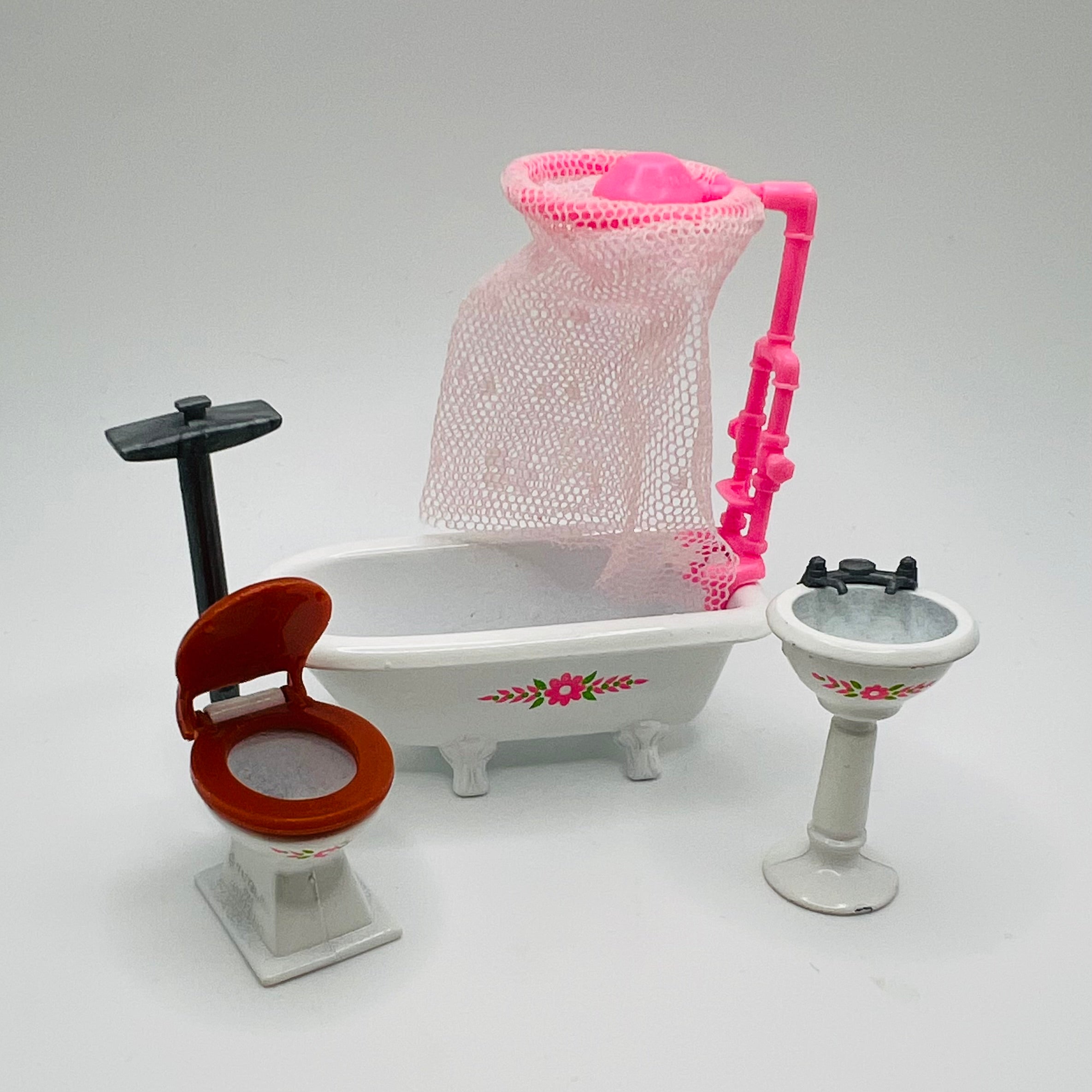 - Bathroom set of 3 pieces (Mattel). Includes a clawfoot tub with shower, a pedestal sink and toilet.