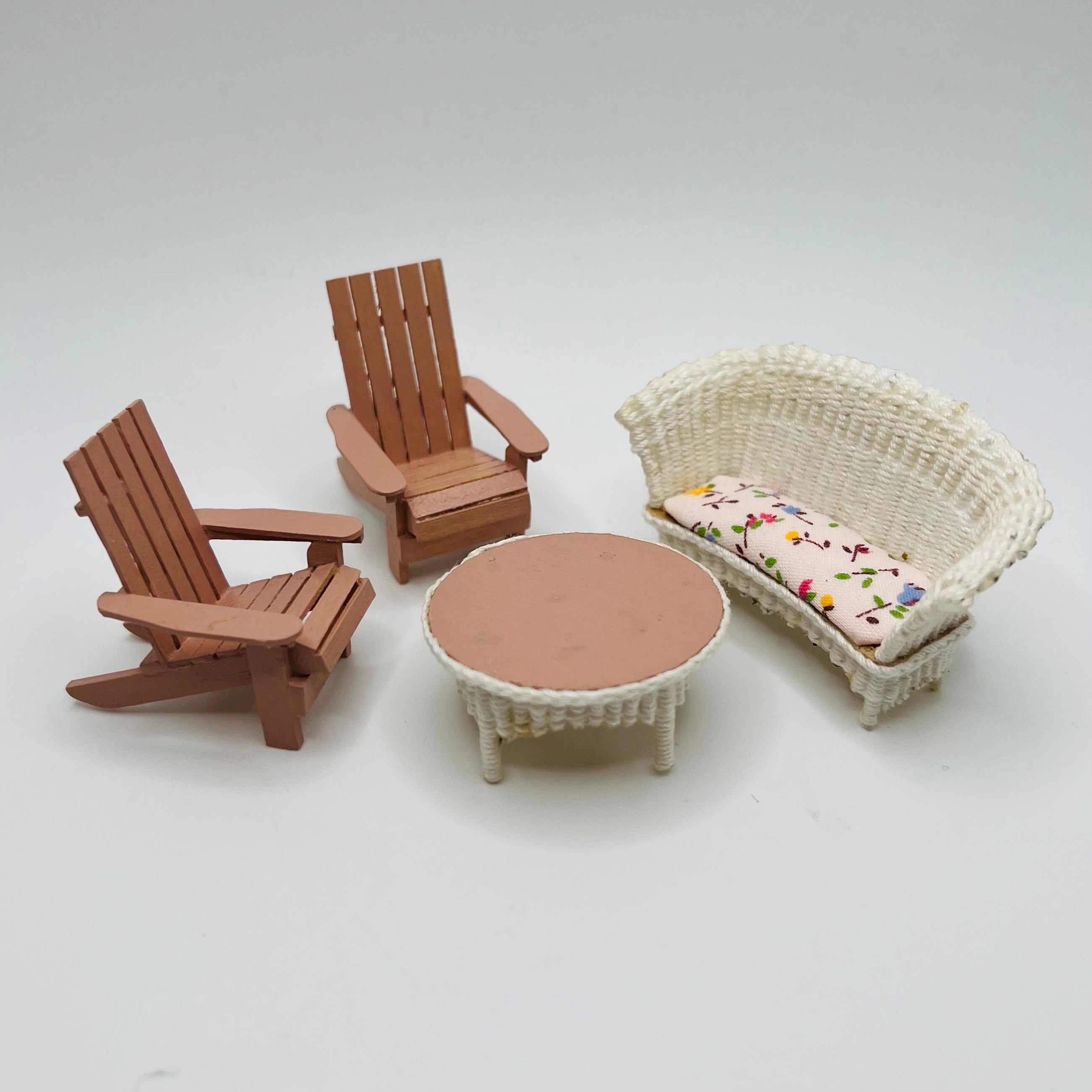- Patio set: 2 Adirondak chairs, one round low table and a wicker loveseat. Adirondak chairs: 1 1/2"H x 1 3/16"W x 1 9/16"D. Loveseat: 2 5/8"W x 1 3/8"H x 1 1/4"D. Table: 11/16"H x 1 9/16"D.