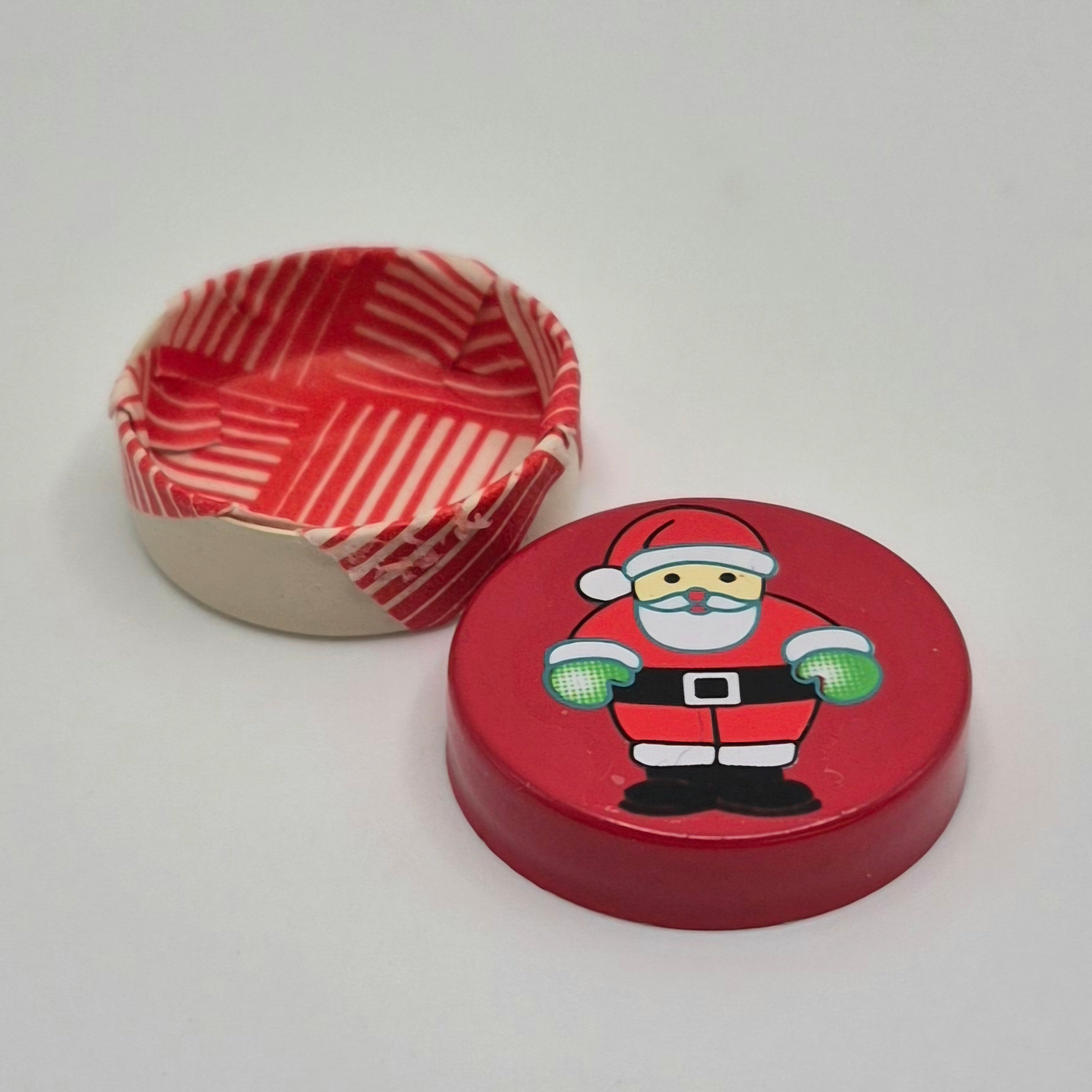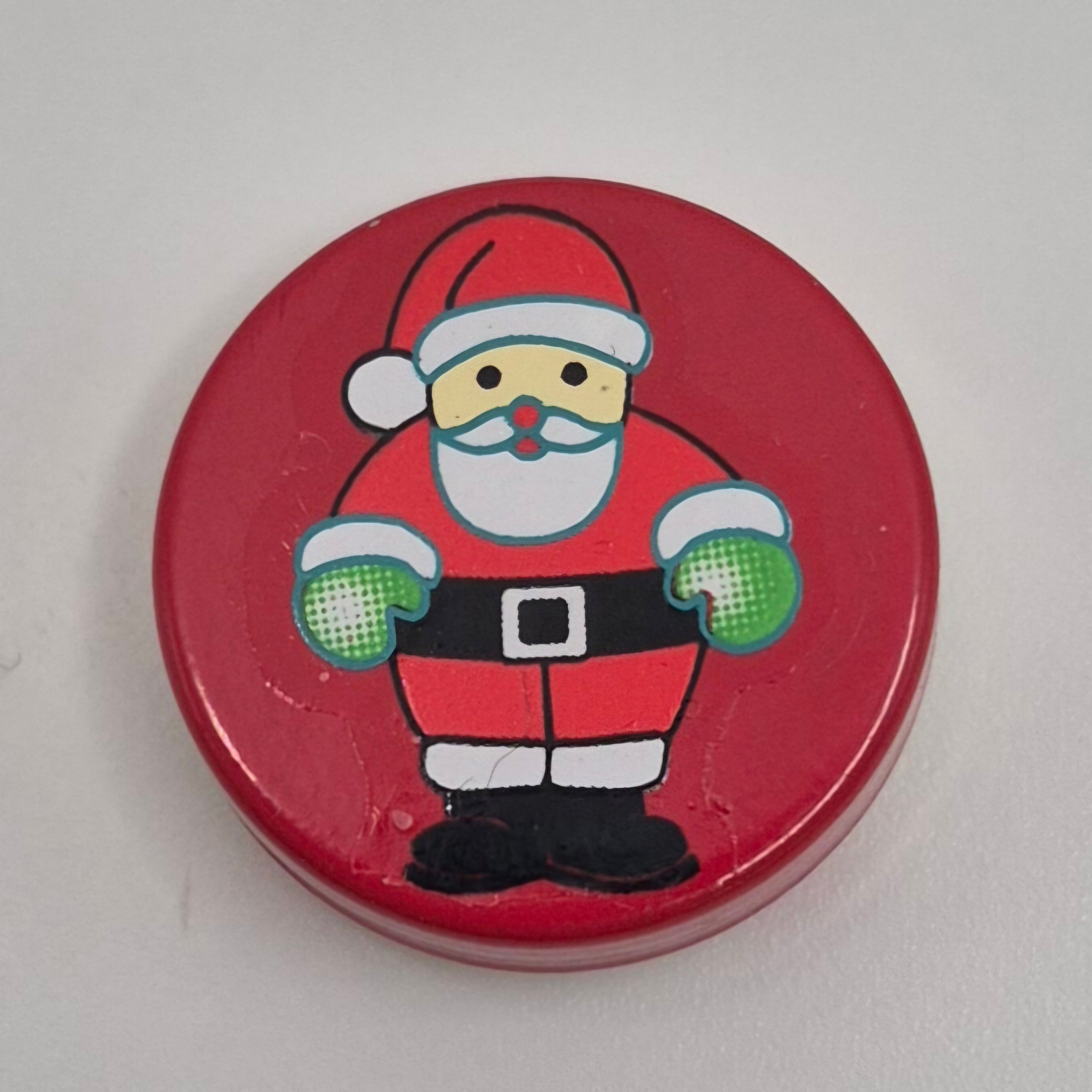 Round metal cookie tin with Santa decal on the lid and decorative paper liner inside. Fill with your favourite Christmas goodies. 1/12 scale miniature for your dollhouse or diorama. 1/4" high x 3/4" diameter.