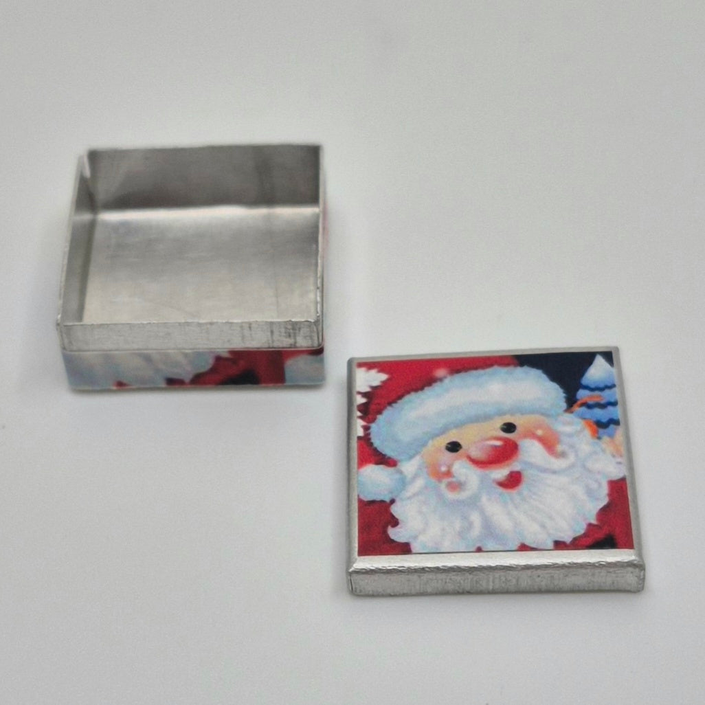 Square metal cookie tin decorated with Santa on the lid. Removable lid allows you to fill with your favourite Christmas goodies. 1/12 scale miniature for your dollhouse or diorama. 3/4" square x 5/16" deep.