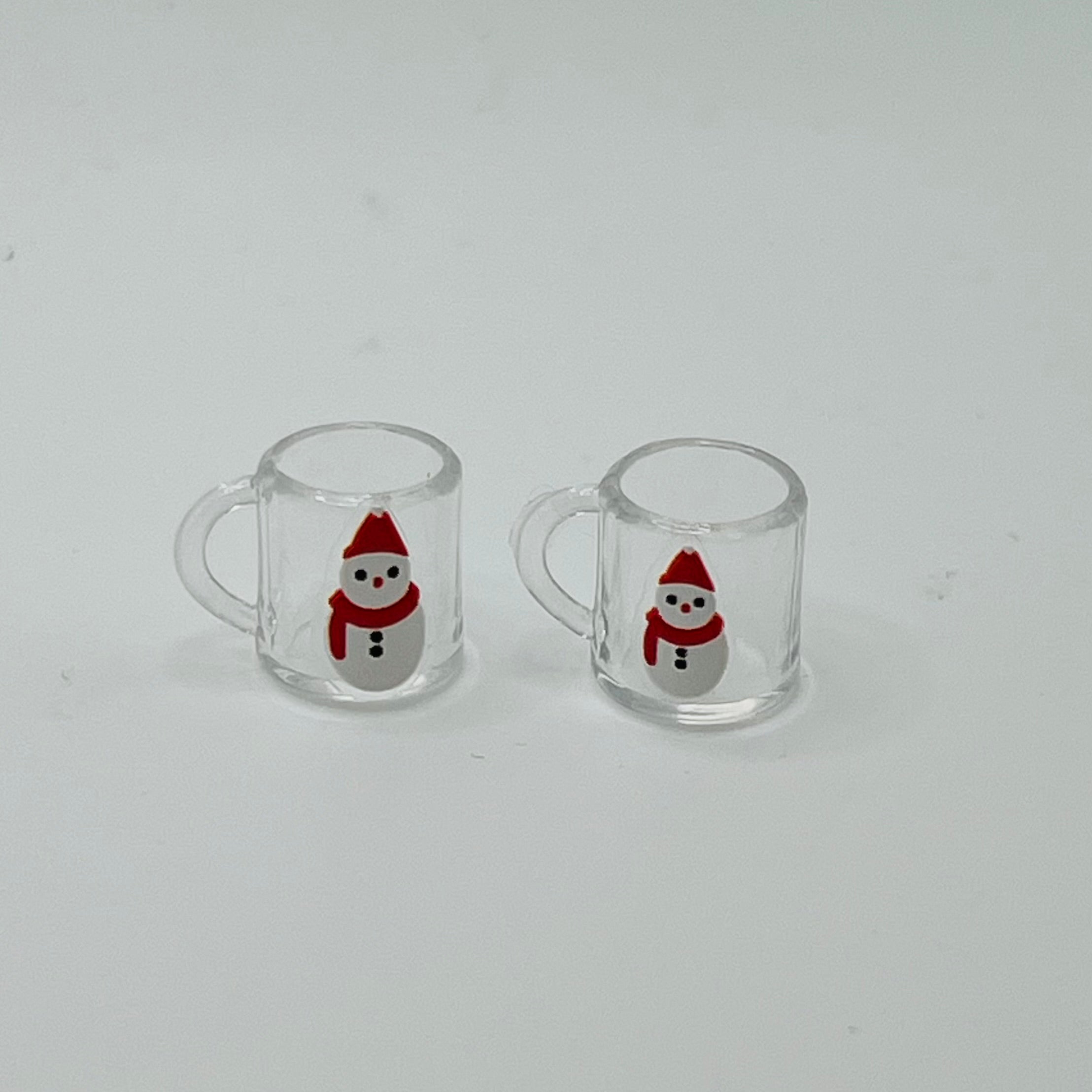 Two cute mugs with a snowman. Plastic. About 3/8" high. Add to the Christmas kitchen table, coffee table...wherever people will gather over the Holidays. 1/12 scale miniature for your dollhouse or diorama.