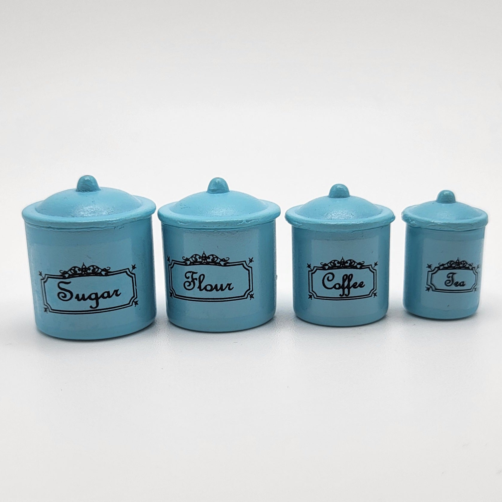 Set of four turquoise canisters with removable lids. The four canisters are sized to fit inside one another. Very nice on your dollhouse kitchen counter. 1/12 scale miniature.