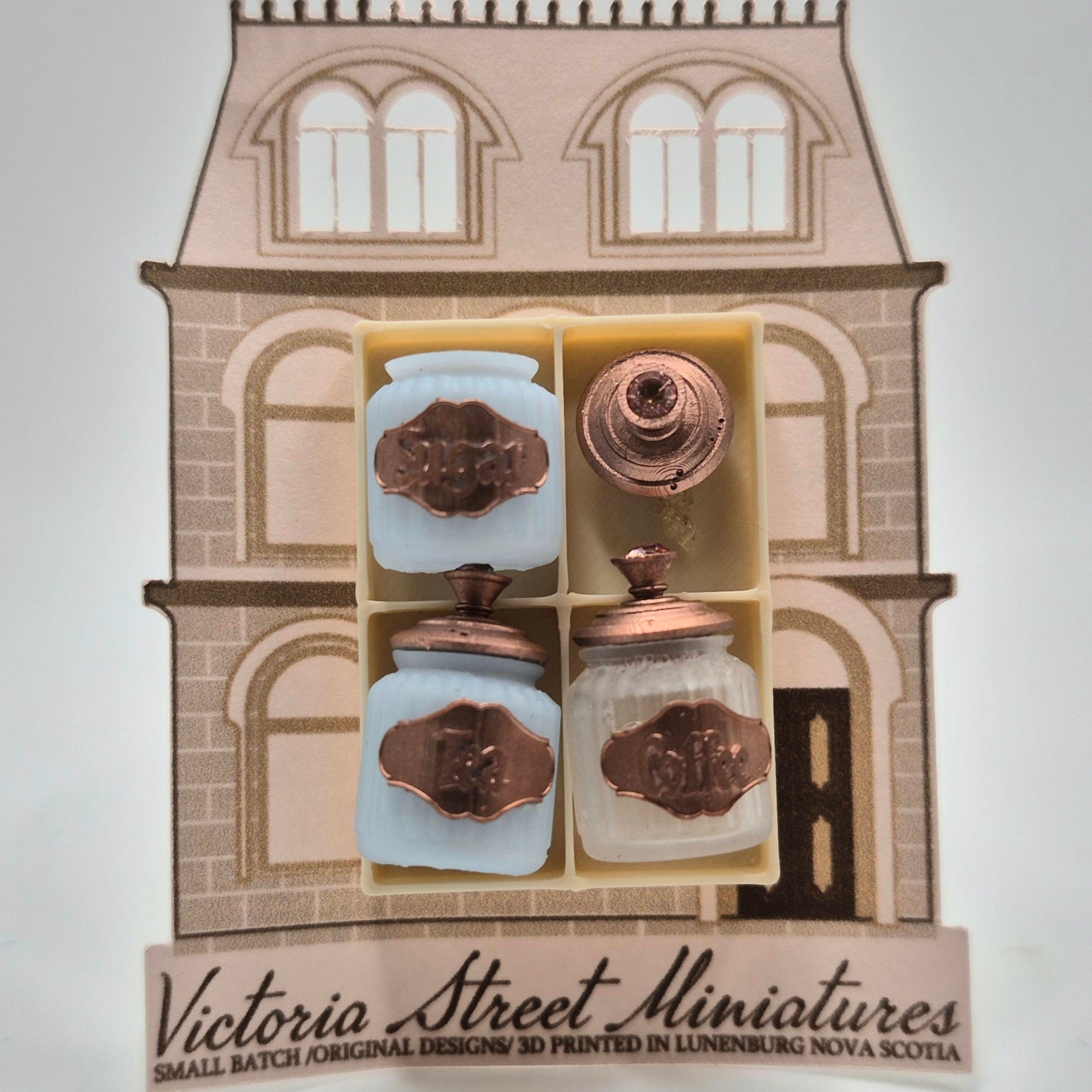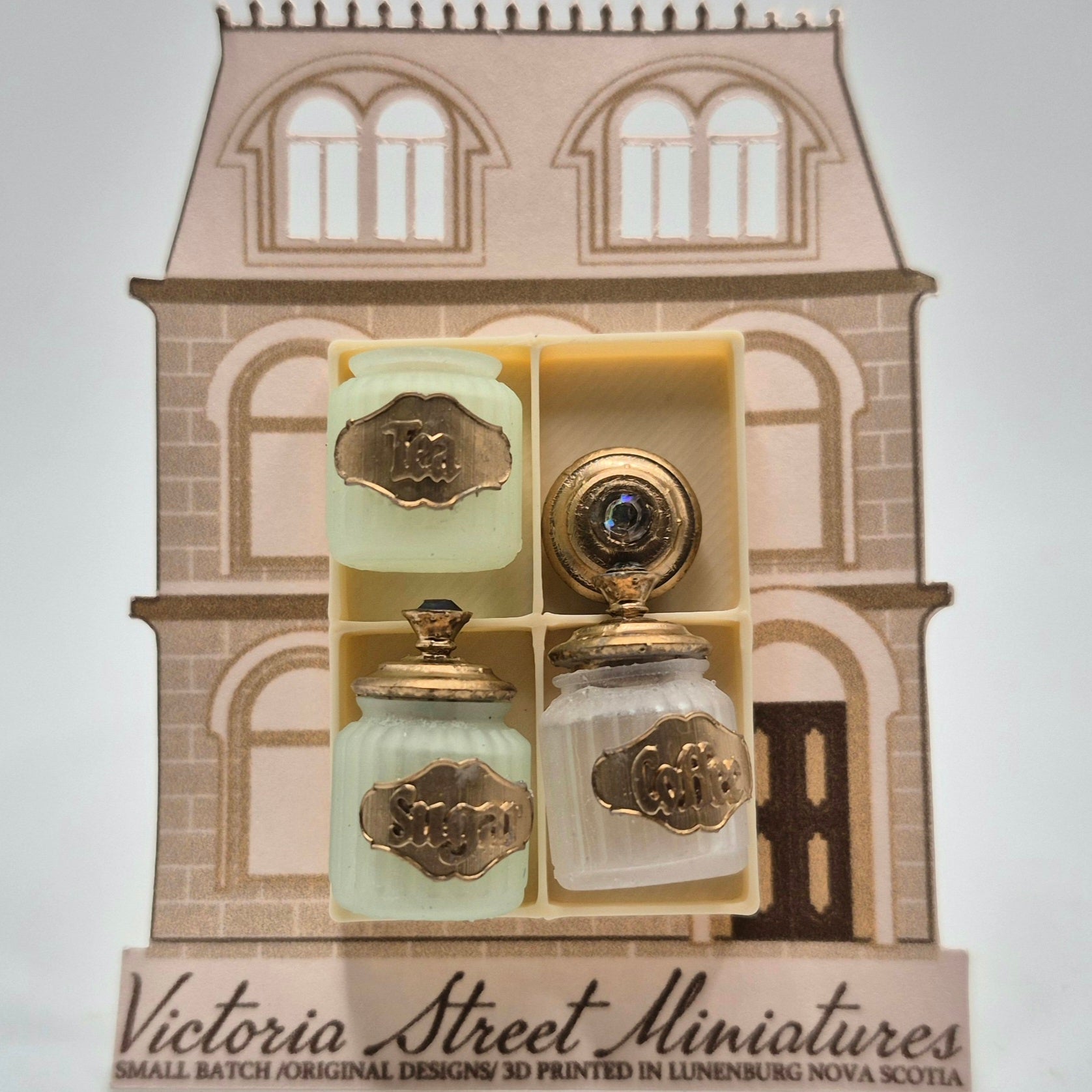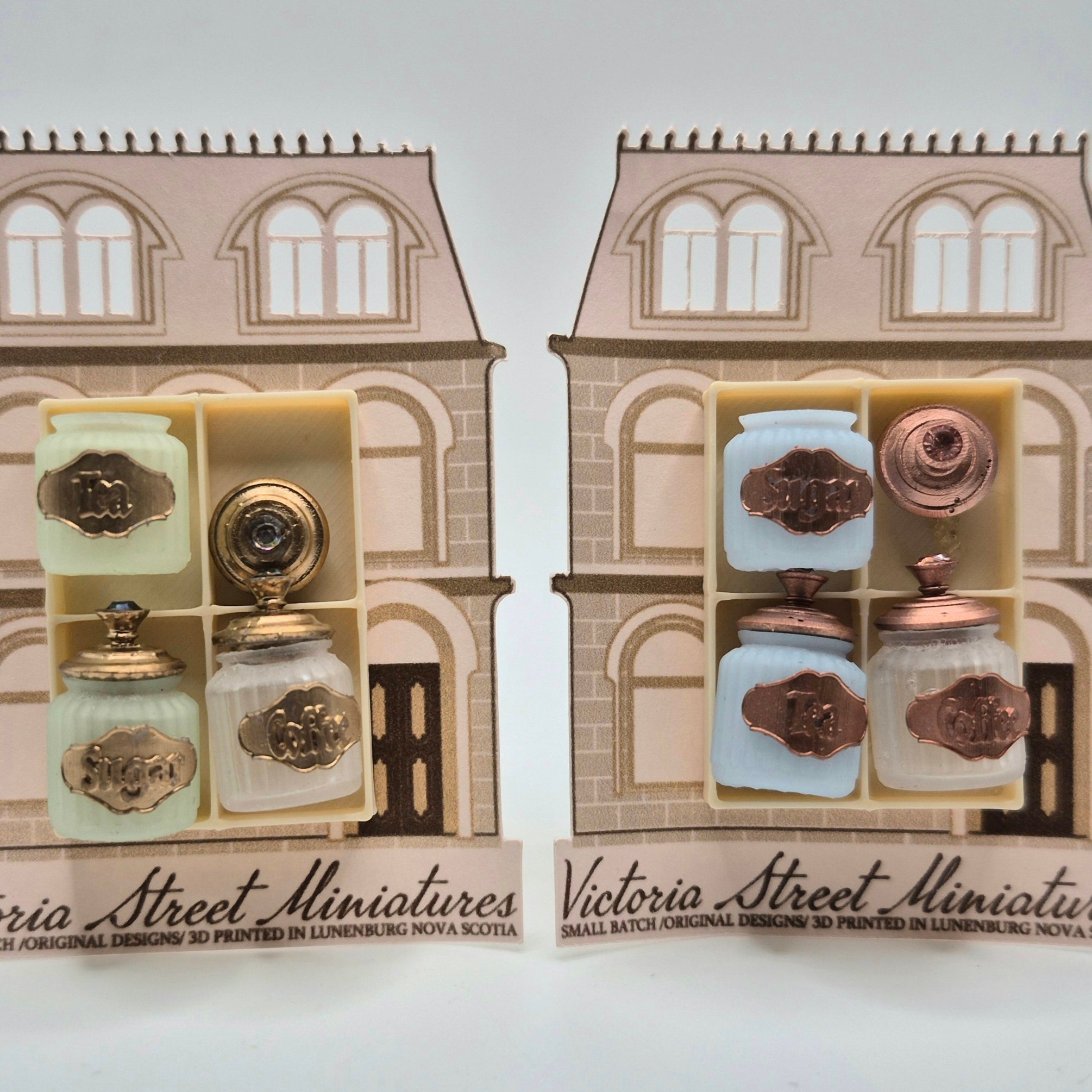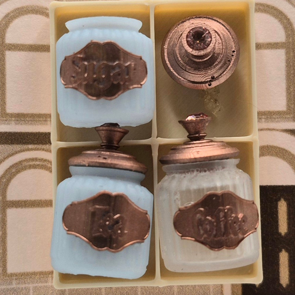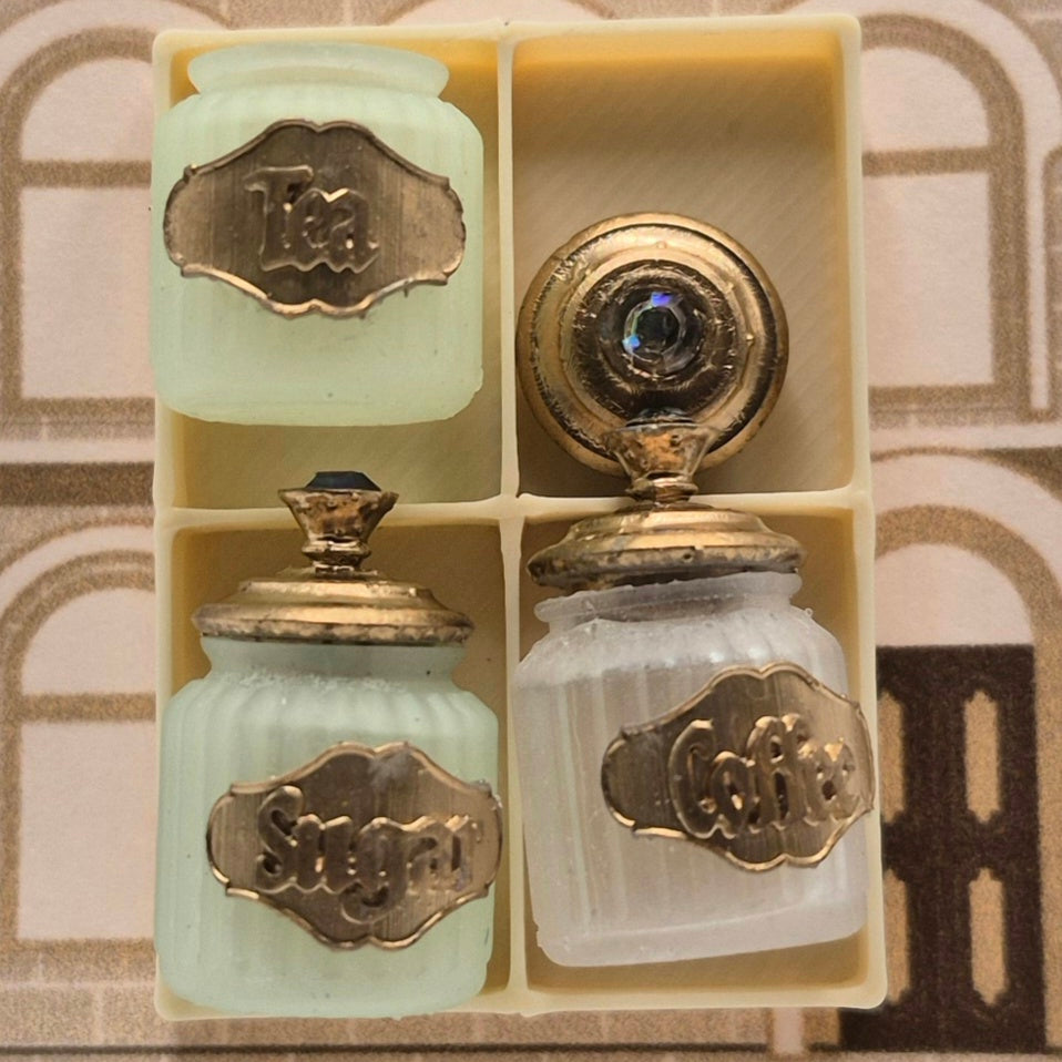 3-piece set of jars labeled "Tea", "Coffee", and "Sugar". All pieces are 3D printed miniatures from NS artisan, Ivette Orellana. Available in green and blue. 1/12 scale miniature for your dollhouse or diorama.