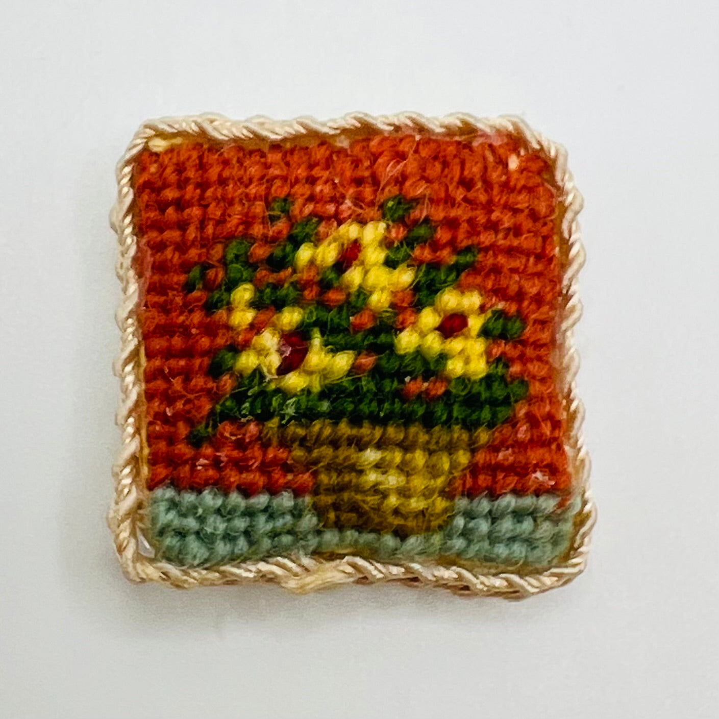 Lovely piece of needlepoint depicting a basket of flowers on a pillow. Add to a sofa or chair in your 1/12 scale miniature dollhouse or diorama bedroom or living room. 1" square.