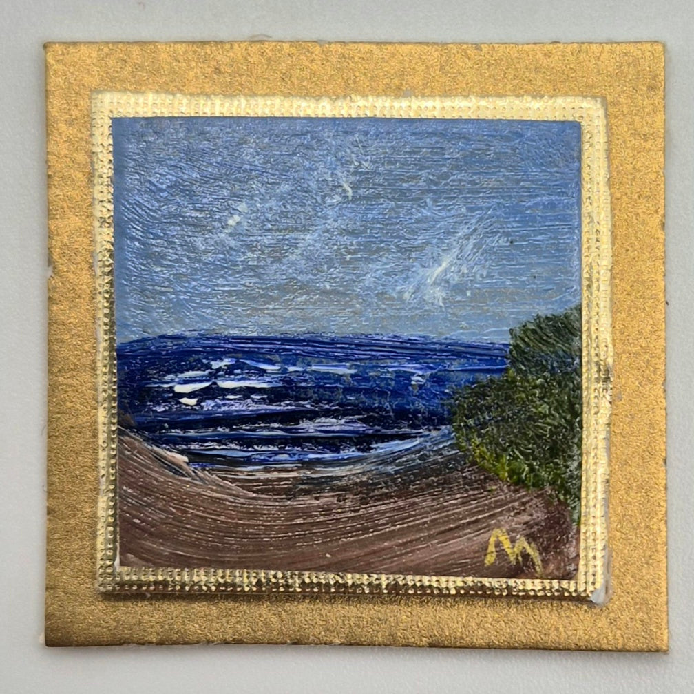 Oil painting by Teri Morris of PEI, Canada. Beach scene mounted on gold card. 1/12 scale miniature artwork for your dollhouse or diorama. 15/16" square.
