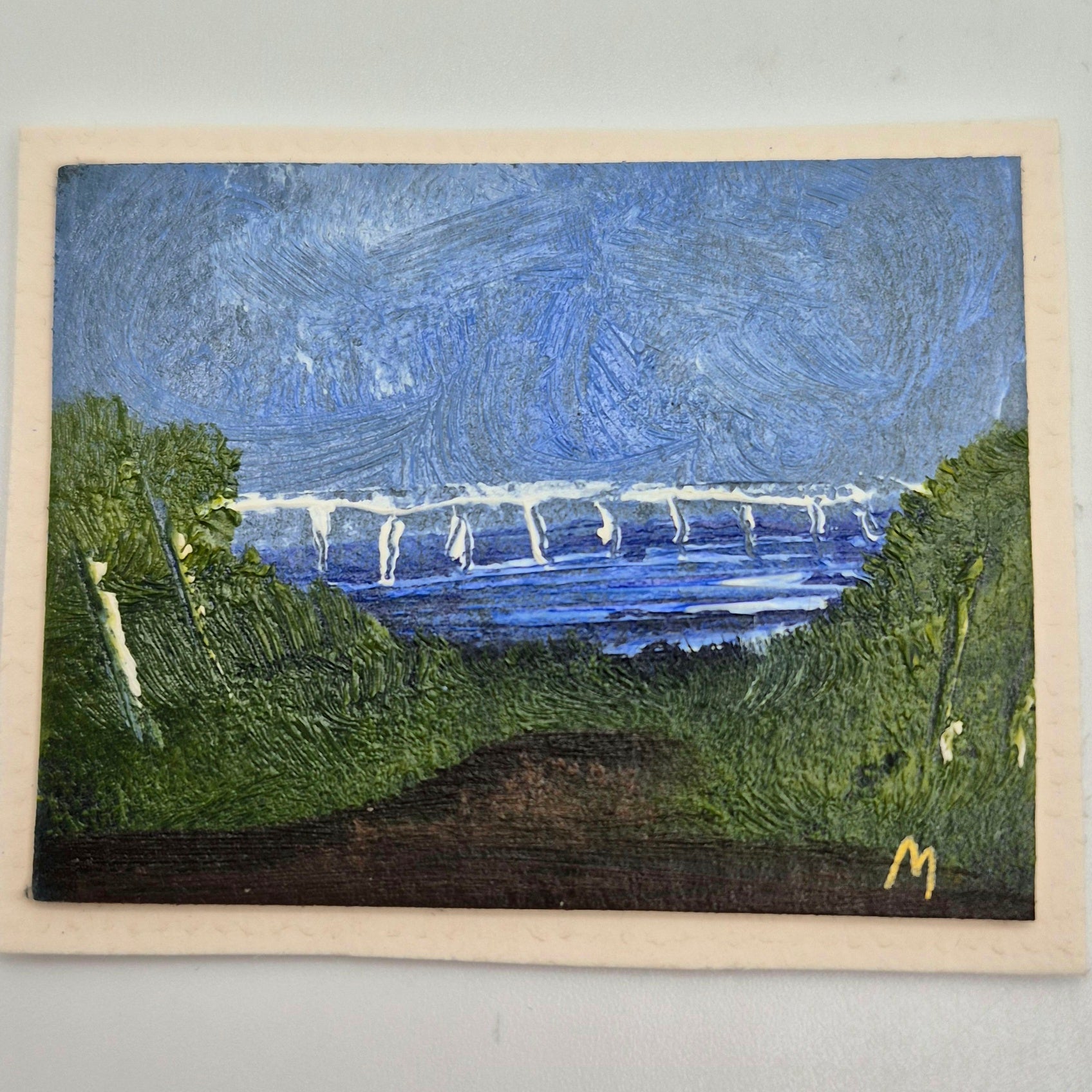Oil painting by Teri Morris of PEI, Canada. Beach scene with bridge over the water. Mounted on white card. 1/12 scale miniature artwork for your dollhouse or diorama. 2 5/16" wide x 1 13/16" high.