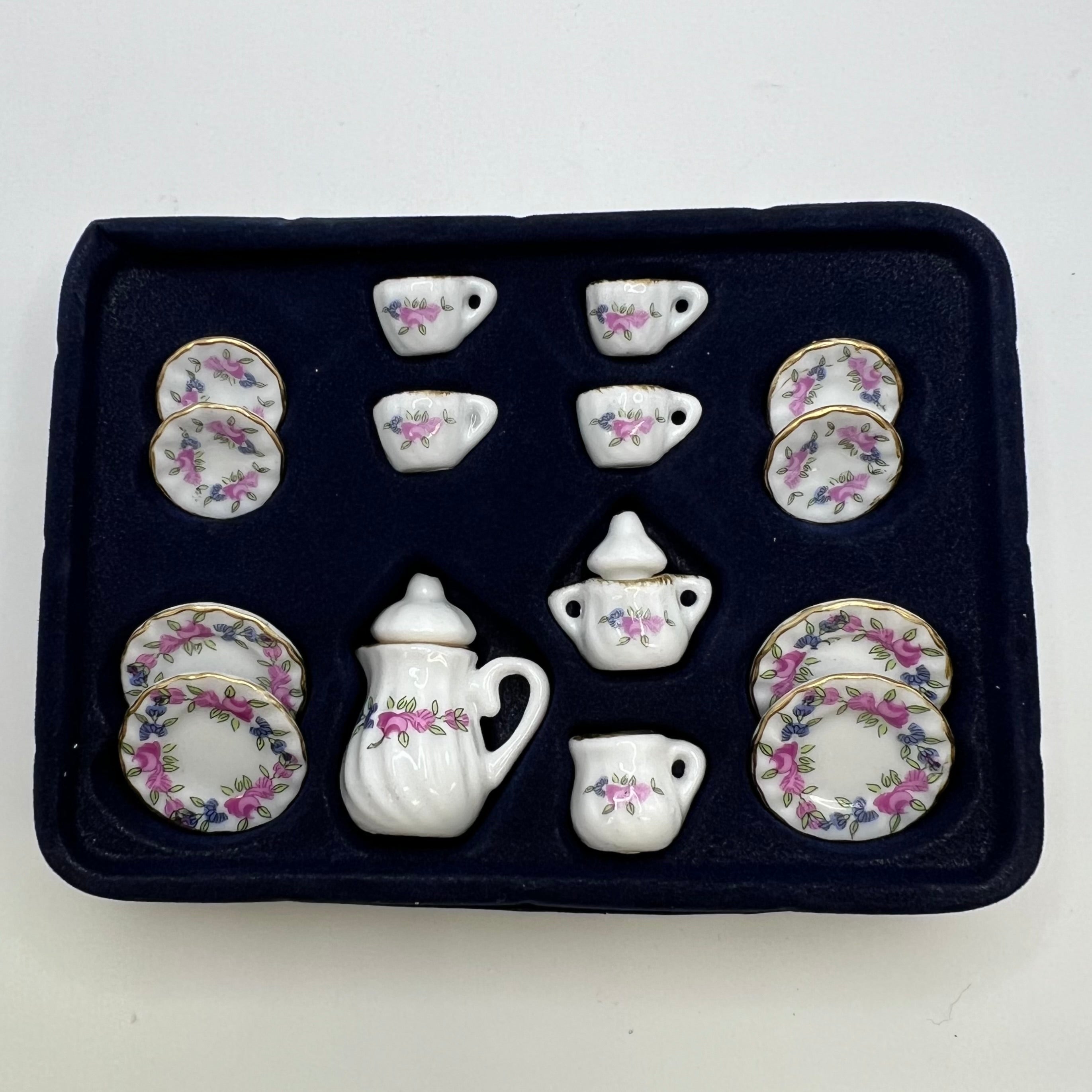 Ceramic Pink and Purple Flowers Tea Set - 17 Pieces - 1/12 Scale Dollhouse Miniature