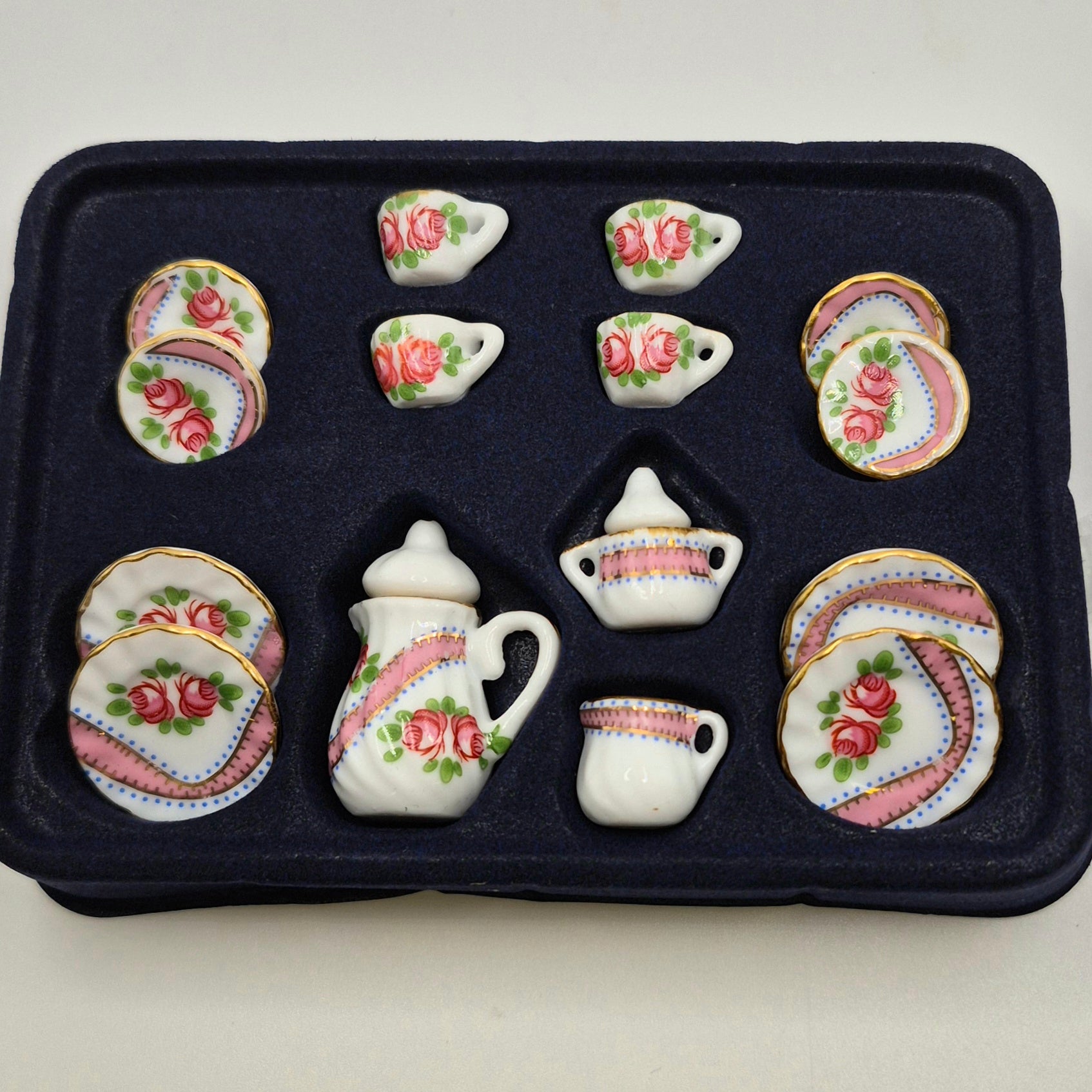 Ceramic Roses & Ribbon Tea Set - 17 Pieces - 1/12 Scale Dollhouse Miniature