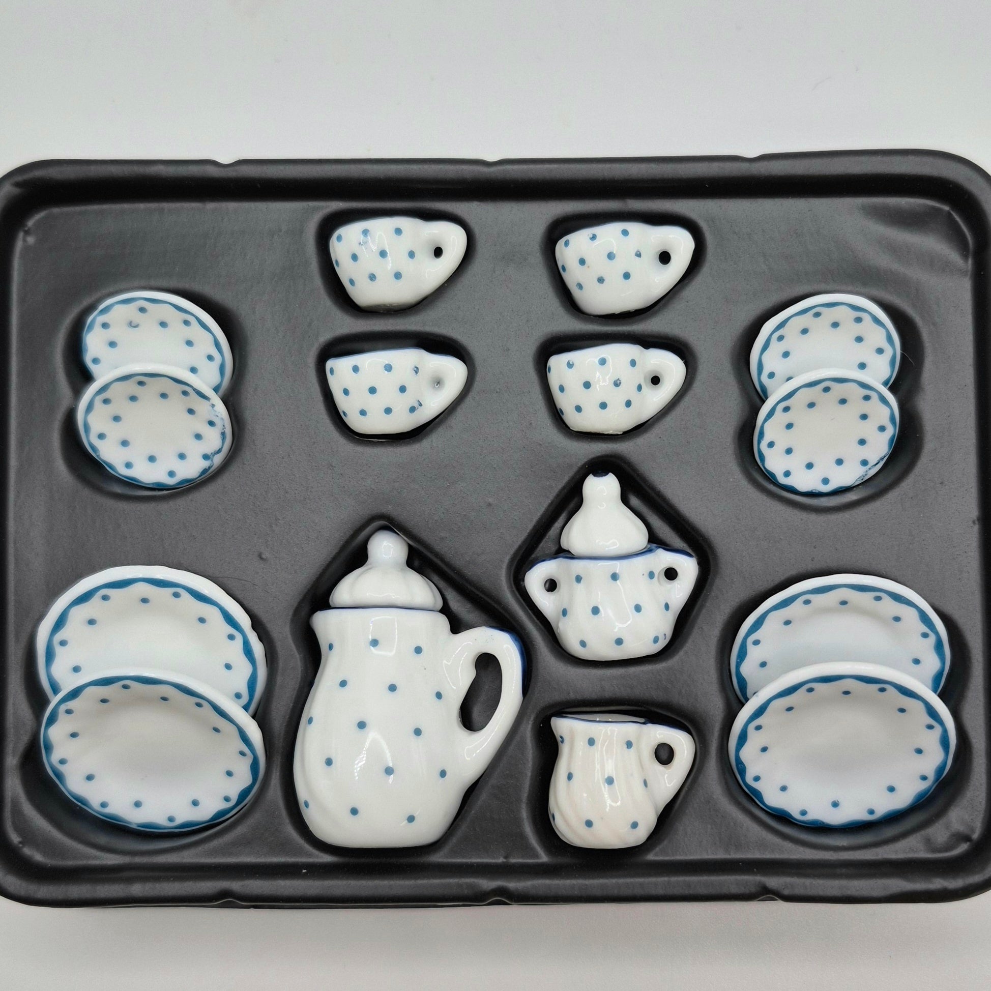 Ceramic White with Blue Polka Dots Tea Set - 17 Pieces - 1/12 Scale Dollhouse Miniature