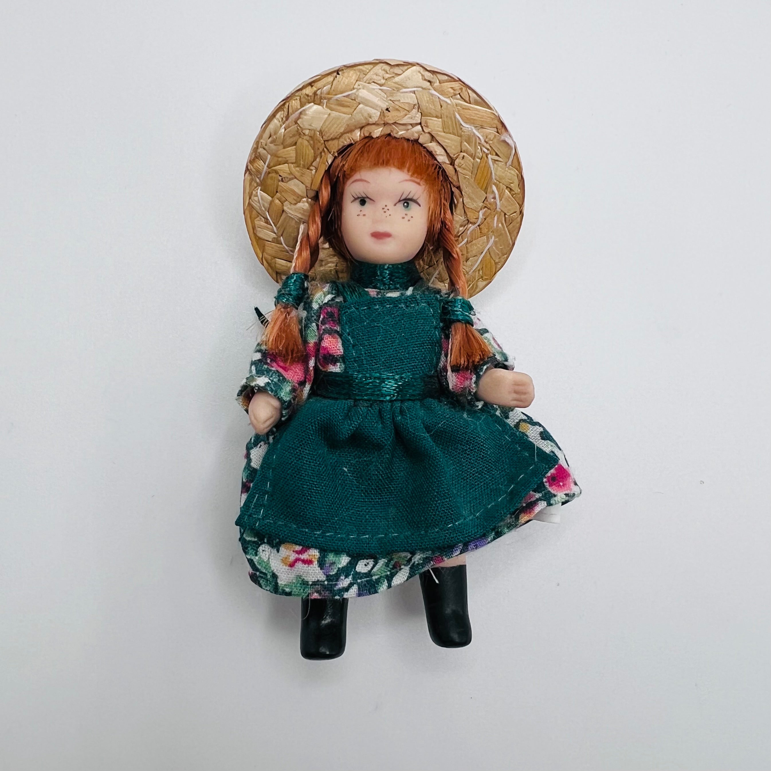 Doll dressed as a Anne of Green Gables, with a green floral dress and a straw hat. Posable. 1/12 scale miniature doll for your dollhouse or diorama. 2 3/4" tall, without the hat.