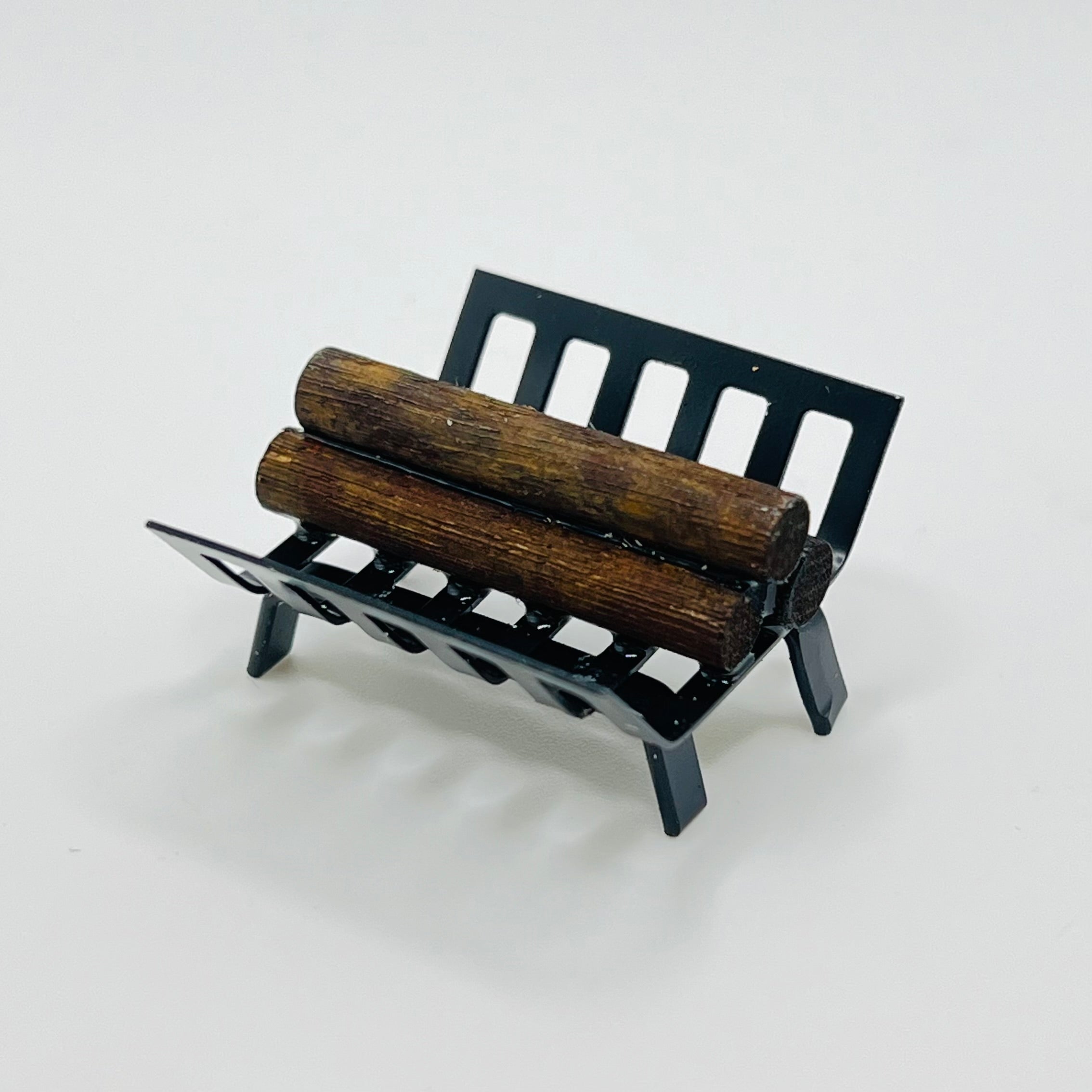 Black metal log holder with split logs for use next to your dollhouse or diorama fireplace. The logs are glued in place. 1/12 scale miniature. 5/8" tall x 1 1/4" wide x 1 1/8" long.