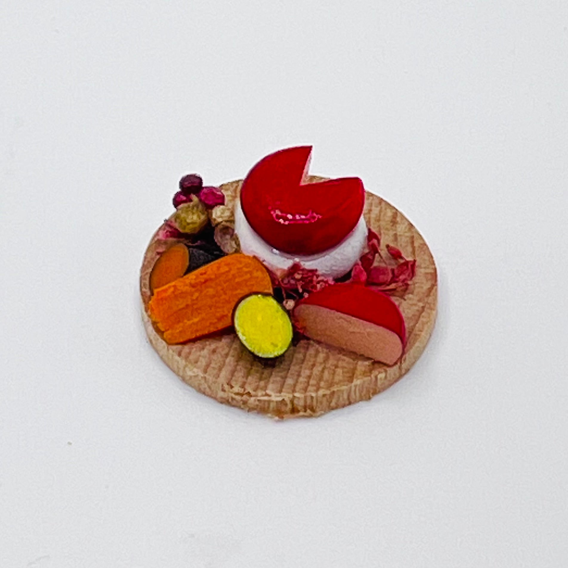 Cute little cheese board has it all: cheeses and grapes, artfully displayed on a wooden board. 1/12 scale miniature for your dollhouse or diorama party. 1" diameter by 1/2" tall.