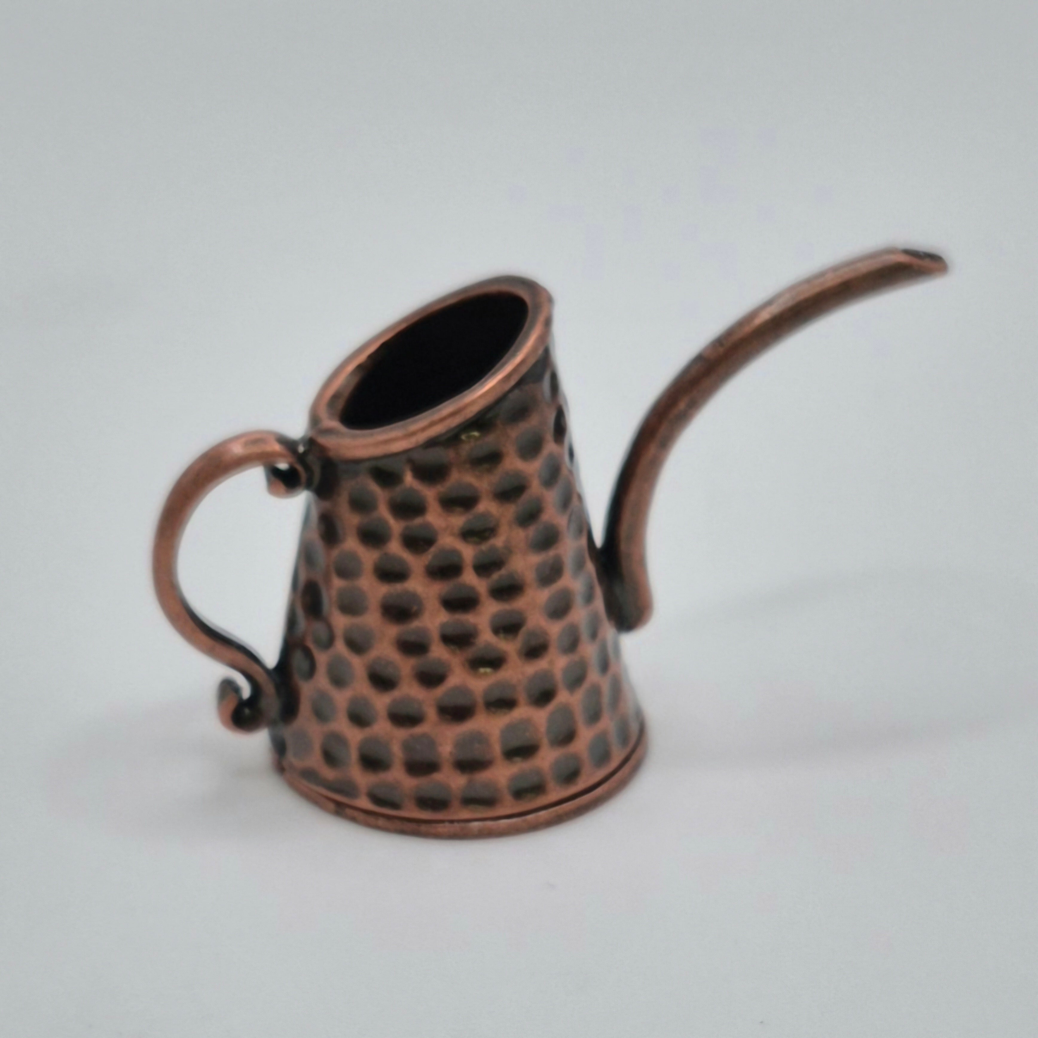 Antique copper, hammered metal, long spout watering can to add to your garden, shed, or front porch. 1/12 scale miniature for your dollhouse or diorama. 1 1/16" tall x 7/8" wide at widest point (plus handle and spout).