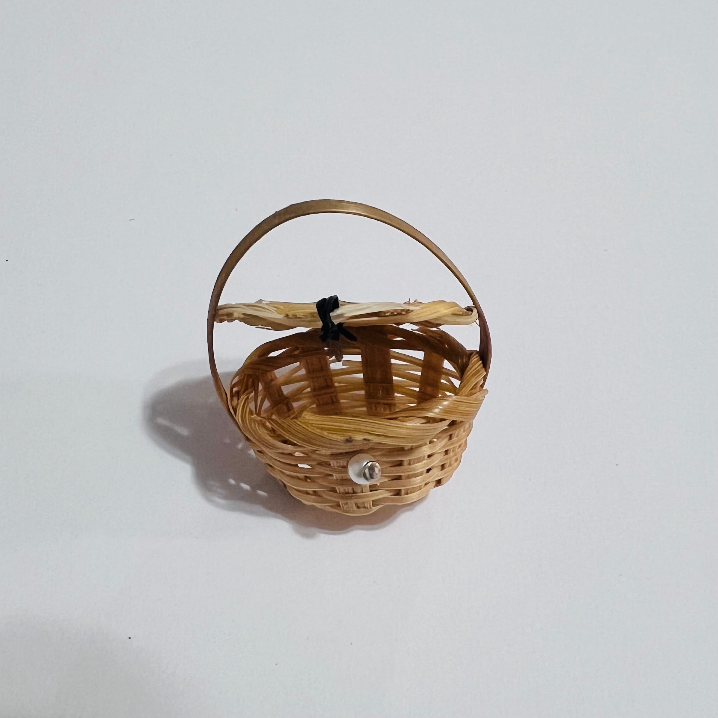 Small round picnic basket with handle. 1 3/8" high x 1 1/8" in diameter.