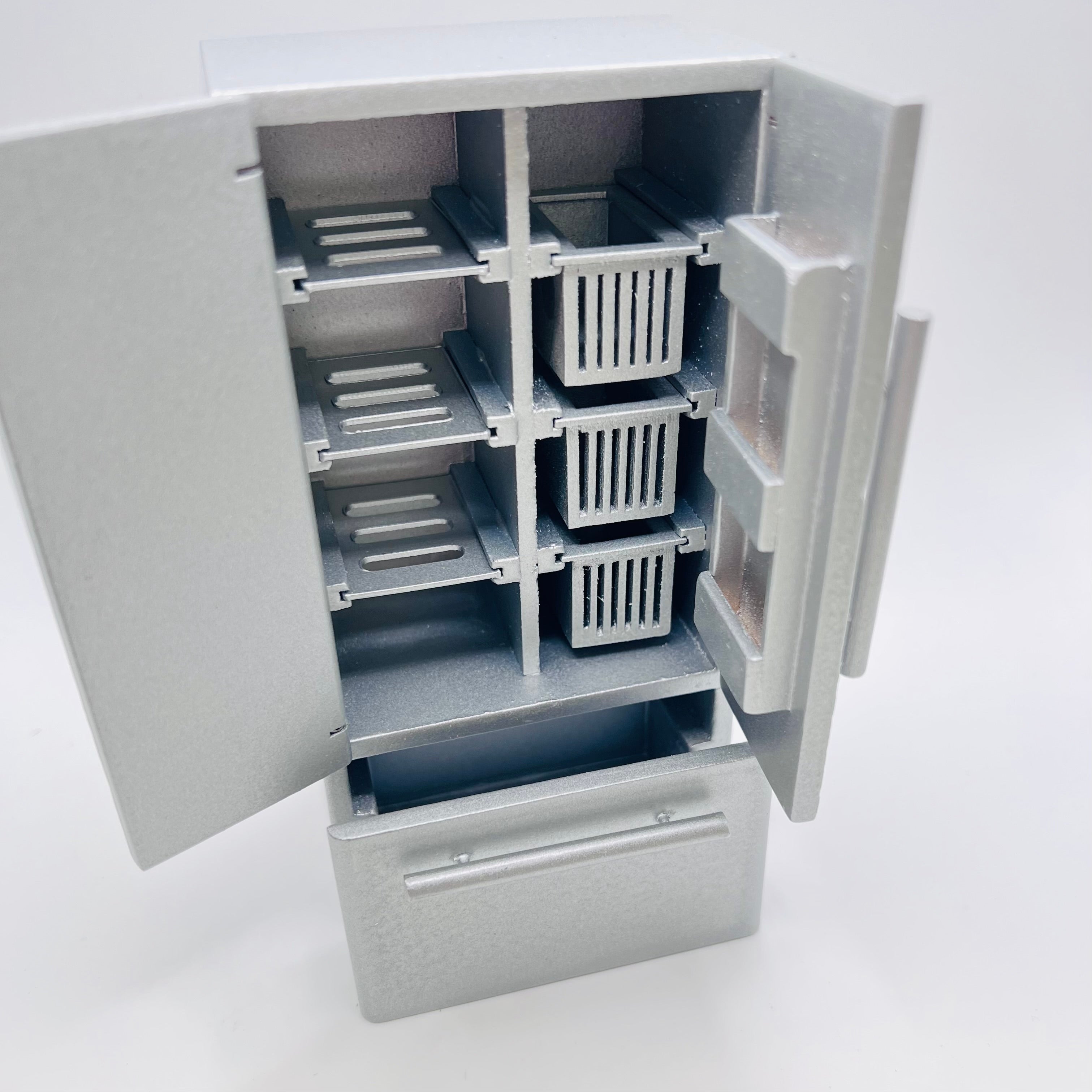 Beautiful silver refrigerator and a bottom freezer. Shelving, baskets and lots of storage space inside. 1/12 scale miniature for your dollhouse or diorama. 5 1/2" high x 2 7/8" wide x 2" deep.