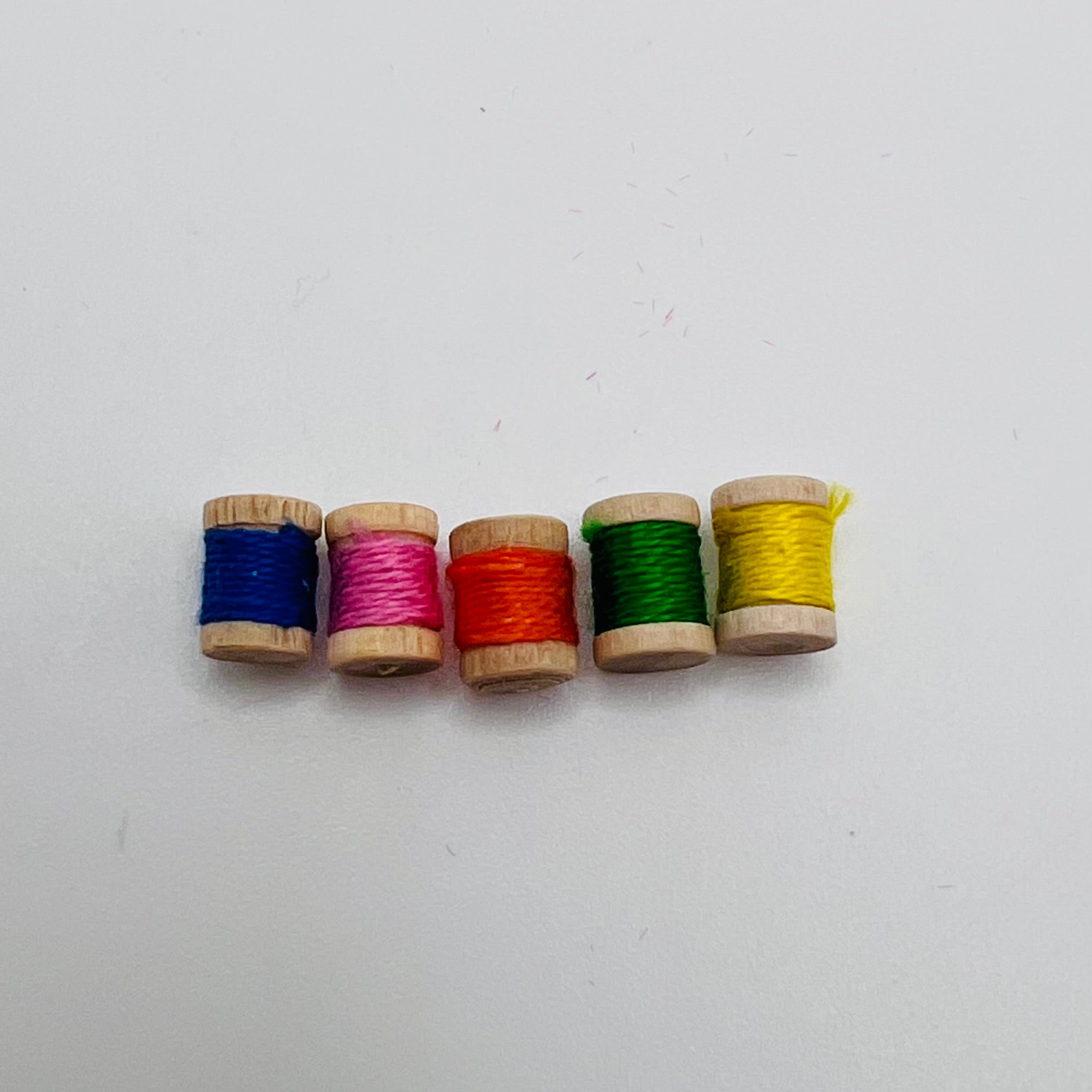 Set of 5 spools of treads: blue, orange,green,pink and yellow. A nice detail for a sewing room, knitting basket, or side table in the family room. 1/12 scale miniature accessory for your dollhouse or diorama.