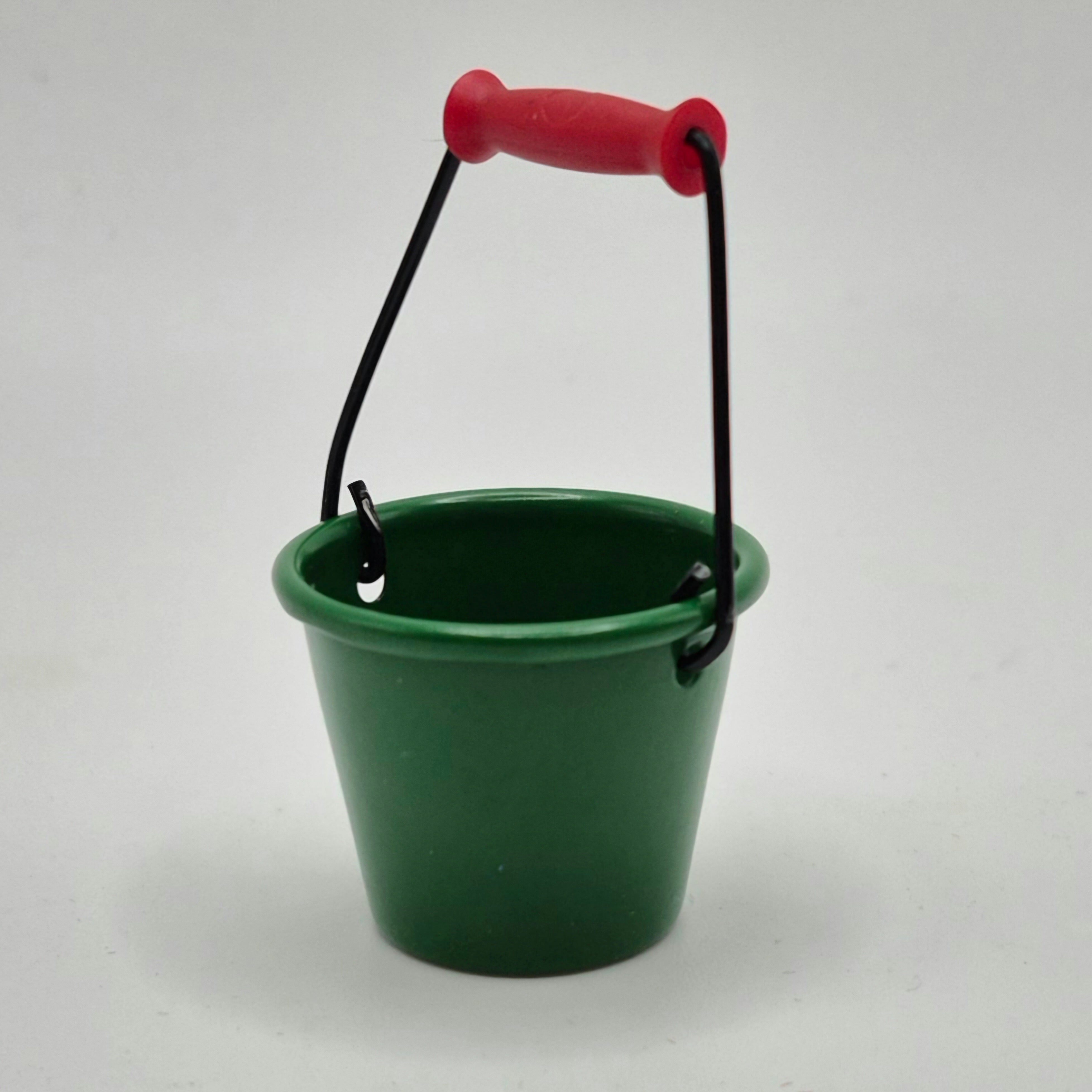 Green metal bucket with handle of black wire and red plastic grip. This can easily find a place in the kitchen, shed, or workshop of your dollhouse or diorama. 1/12 scale miniature. Bucket, without handle is 3/4" high x 1" diameter.