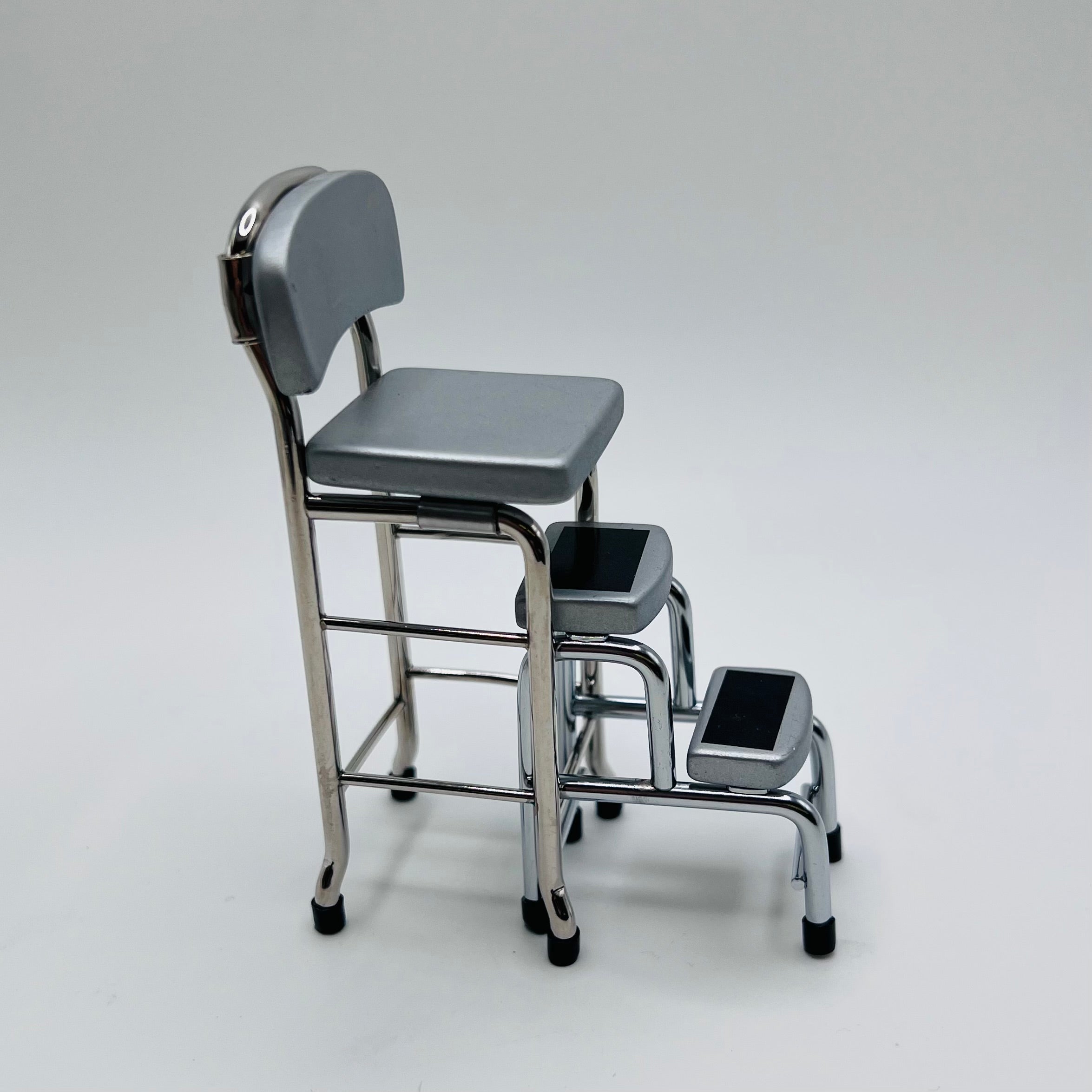 This miniature stool should bring back memories for many. A 1/12 scale version of a classic kitchen stool in silver or black. Add it to your dollhouse kitchen or even a workshop. Two parts, the main stool and the steps.