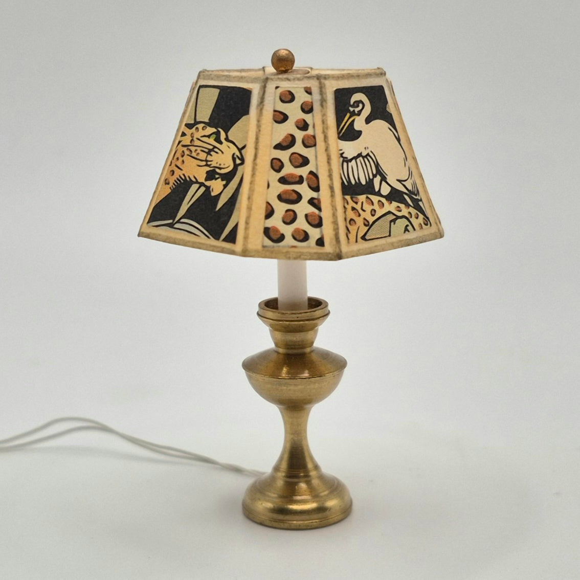 Brass table lamp with a paper wildlife motif shade. 12 volt light with replaceable bi-pin grain of wheat bulb. Suited to an office, living room or study in your dollhouse or diorama. 1/12 scale miniature. 2" tall x 1 1/4" across.