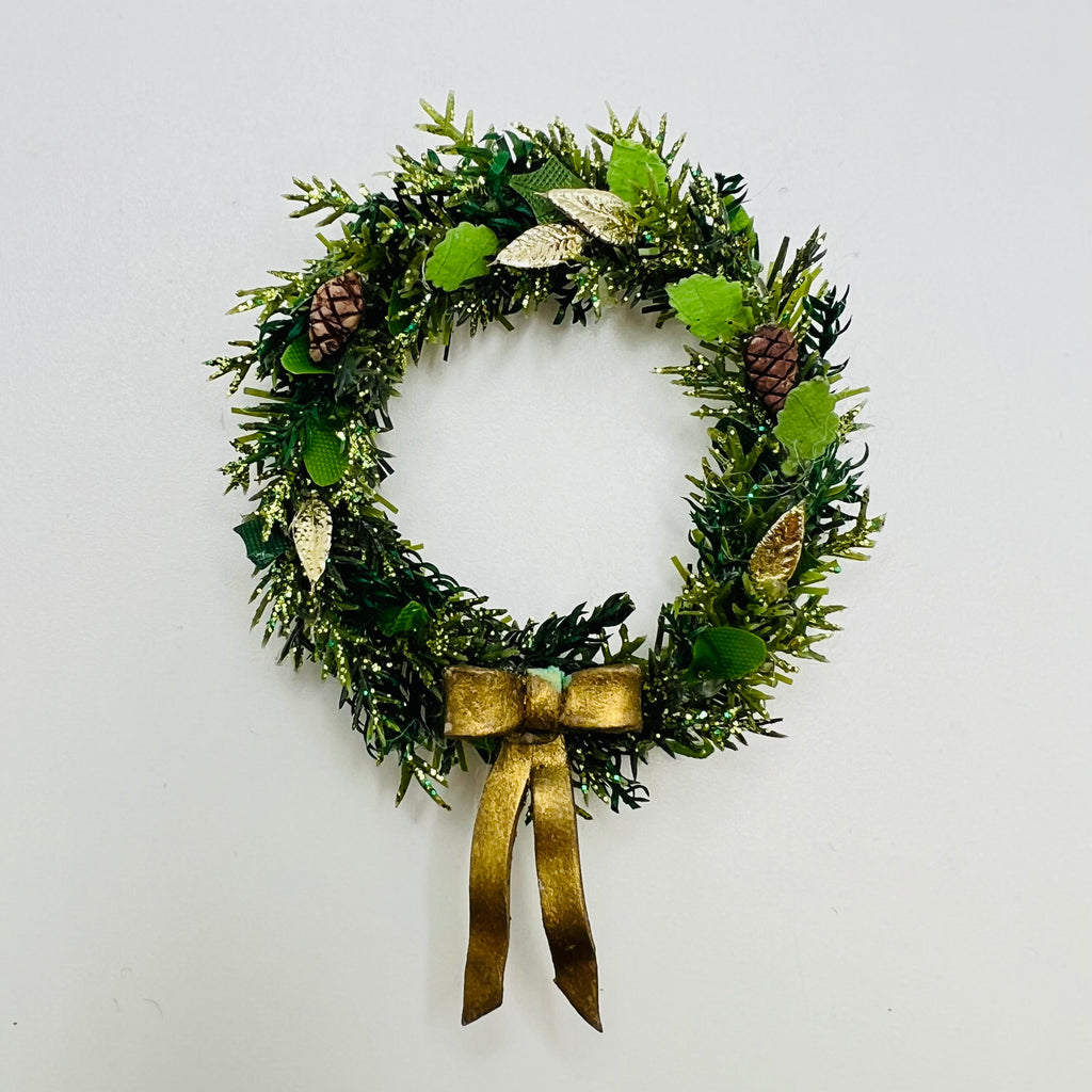 Christmas Wreath - Greenery/Pine Cones/Gold and Bow - 1/12 Scale Dollhouse Miniature