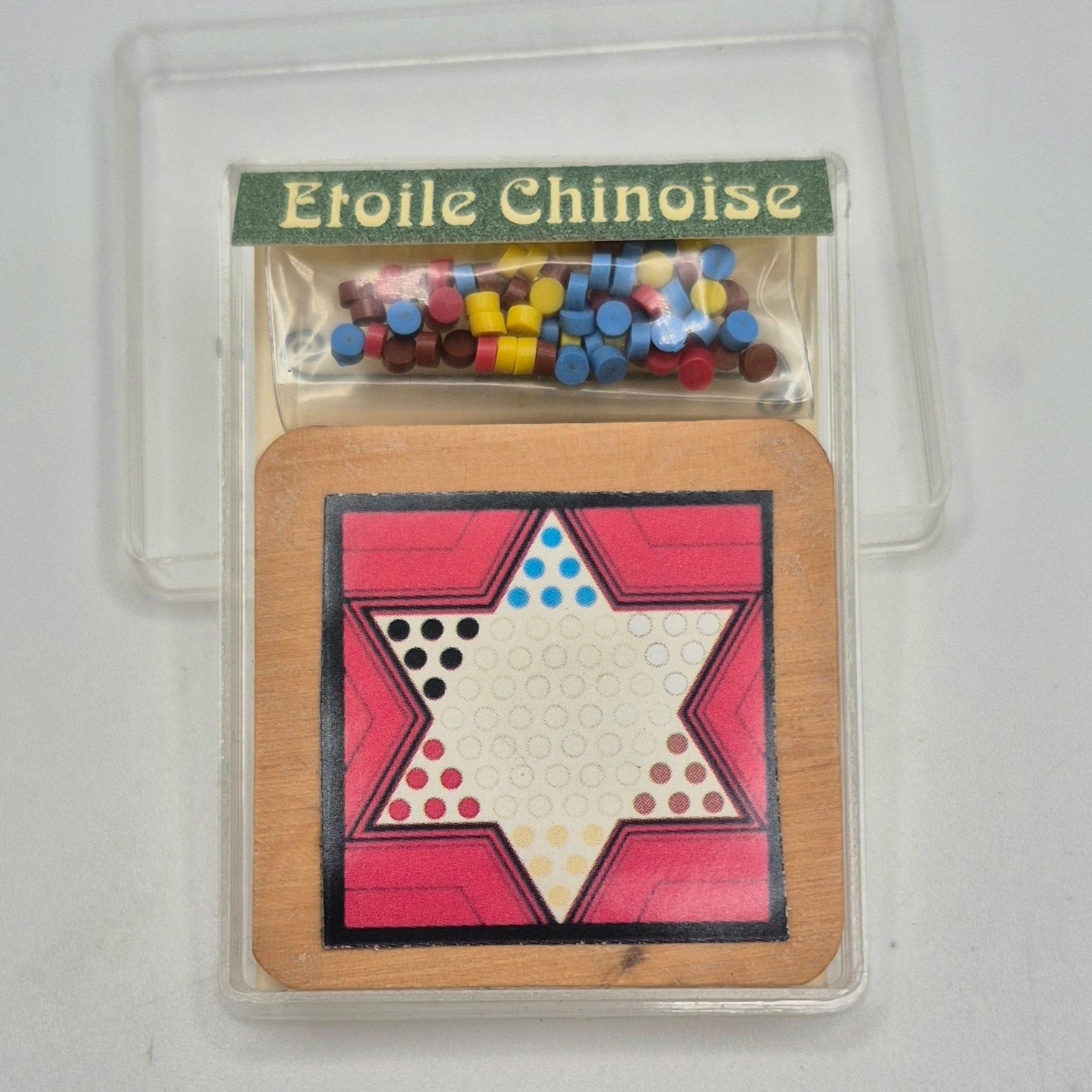 Made in France by Marc Vidal, this is a good quality Chinese Checkers game with board and multi-colour discs for playing. The game board is set on a wooden base. 1 1/2" square x 3/16" thick.
