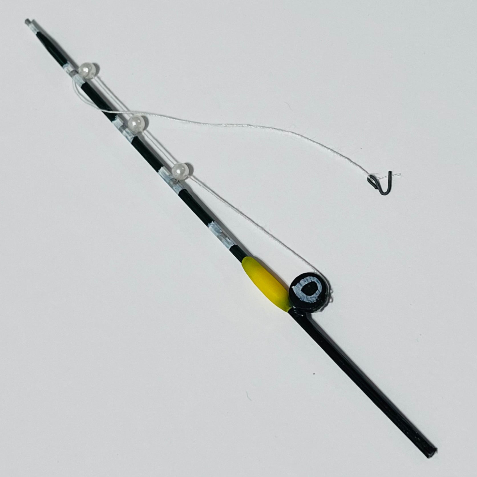 A fishing rod with line and hook. Add to an outdoor fishing diorama, place in the basement or attic or shed, or have ready to go on the front porch. 1/12 scale miniature for your dollhouse or diorama. 5 15/16"
