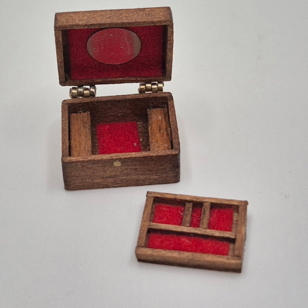 Lovely handmade wooden jewellery box with removable tray. Previously owned. 1/12 scale miniature for the bedroom of your dollhouse or diorama. 3/8" high x 3/4" long x 1/2" wide.