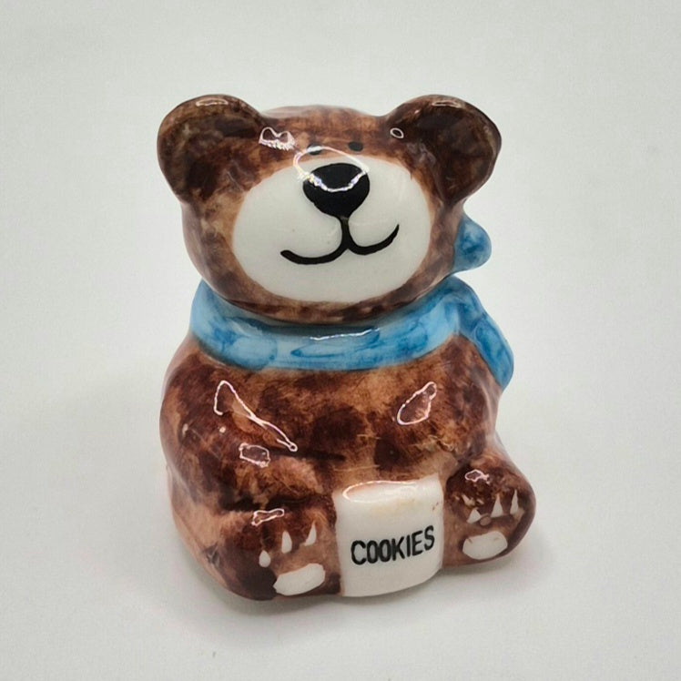 Large ceramic teddy bear cookie jar. Main body of the bear, where the cookies would be, is about 1/2" high. Slightly larger than 1/12 scale, but will still make you smile :) 1 1/16" high x 7/8" wide x 7/8" deep.