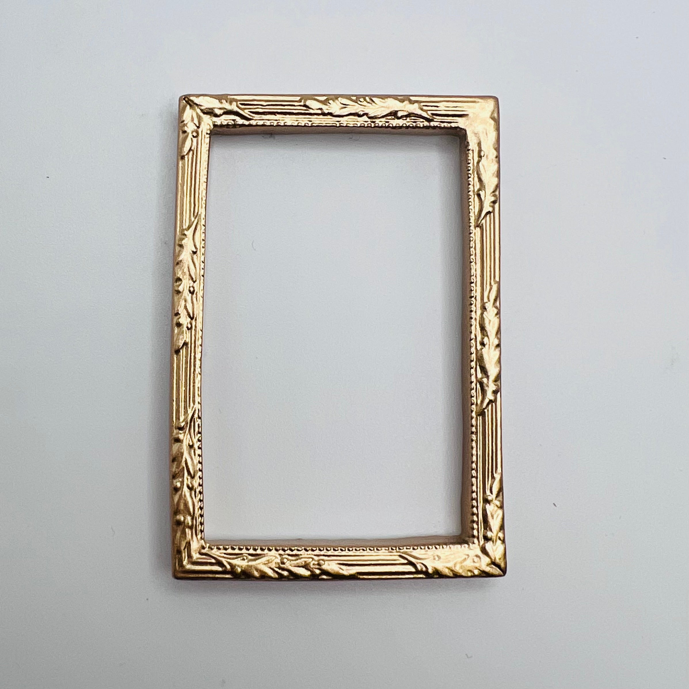 Gold resin decorative picture frame. When you need to highlight a special portrait or painting with just the right level of ornamentation. 1/12 scale miniature for dollhouse or diorama. Outside 2 3/8" x 1 5/8". Inside 2 1/16" x 1 5/16".