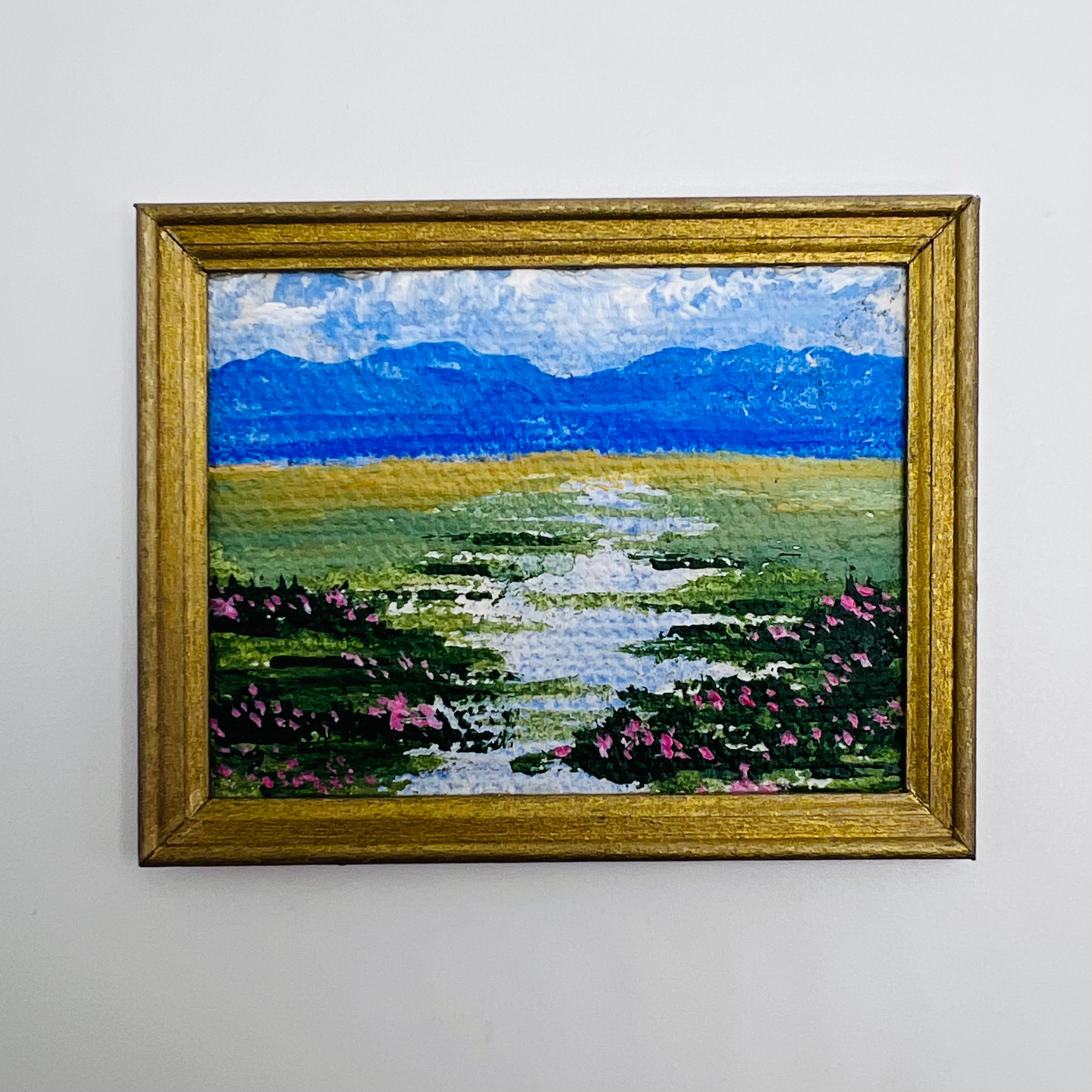 Beautiful painting of a river with flowers and mountains in the background. Bright with a gold frame. Signed on reverse "Tommie Moore 2004". 1/12 scale miniature artwork for your dollhouse or diorama. 2 1/2" x 2".
